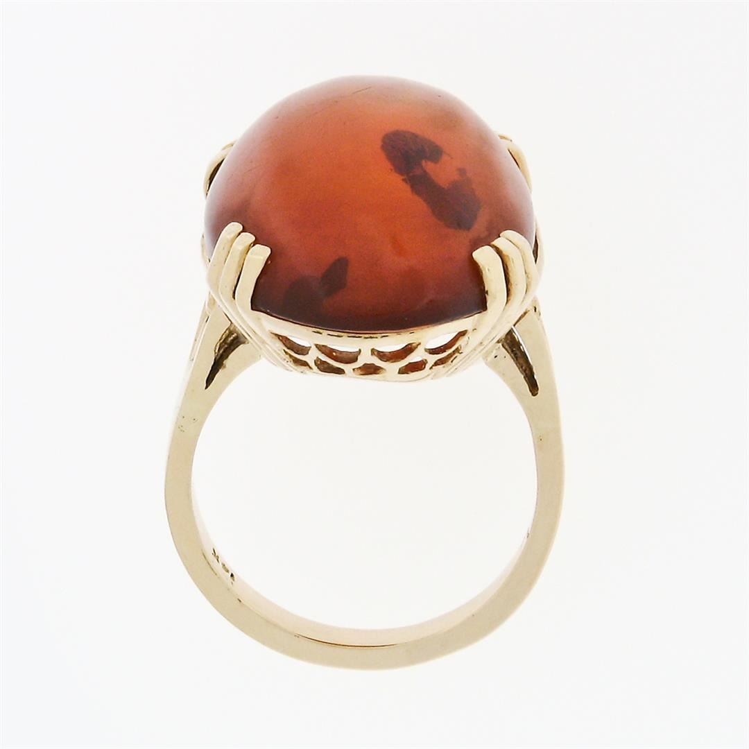 A vintage solid 14k yellow gold statement ring with 1 large oval cabochon cut natural amber (30.5x18.1mm). The ring is size 9.5, weighs a total of 8.96 grams, and measures 30.5mm wide.