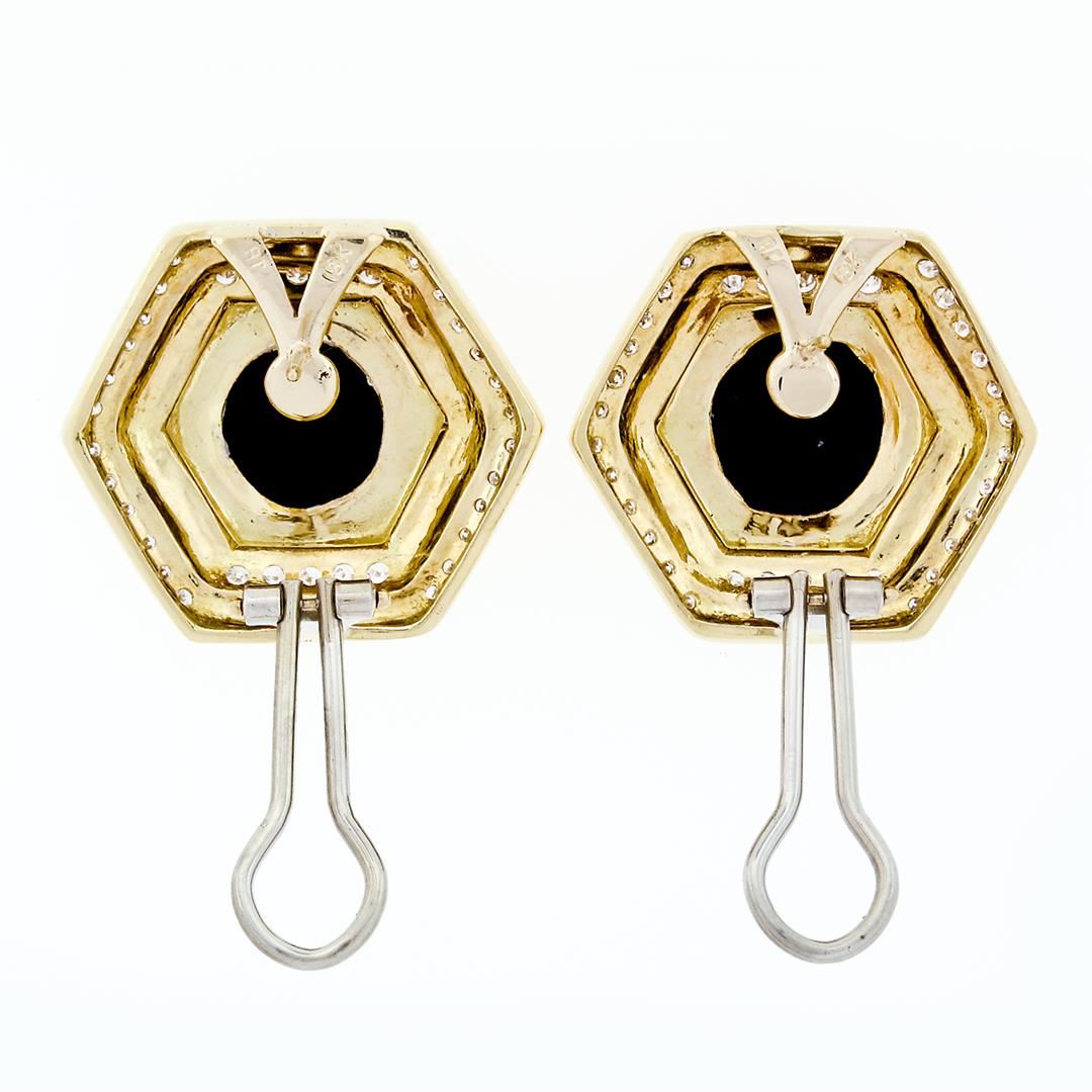A pair of vintage solid 18k yellow gold Hexagon Earrings, with 2 carved round cut black onyx (12.9mm), and surrounded by round brilliant cut natural diamonds (F/G - VS1/VS2; 0.75ctw). The earrings measure approximately 25.82x28.69mm and weigh a total of 26.54 grams.