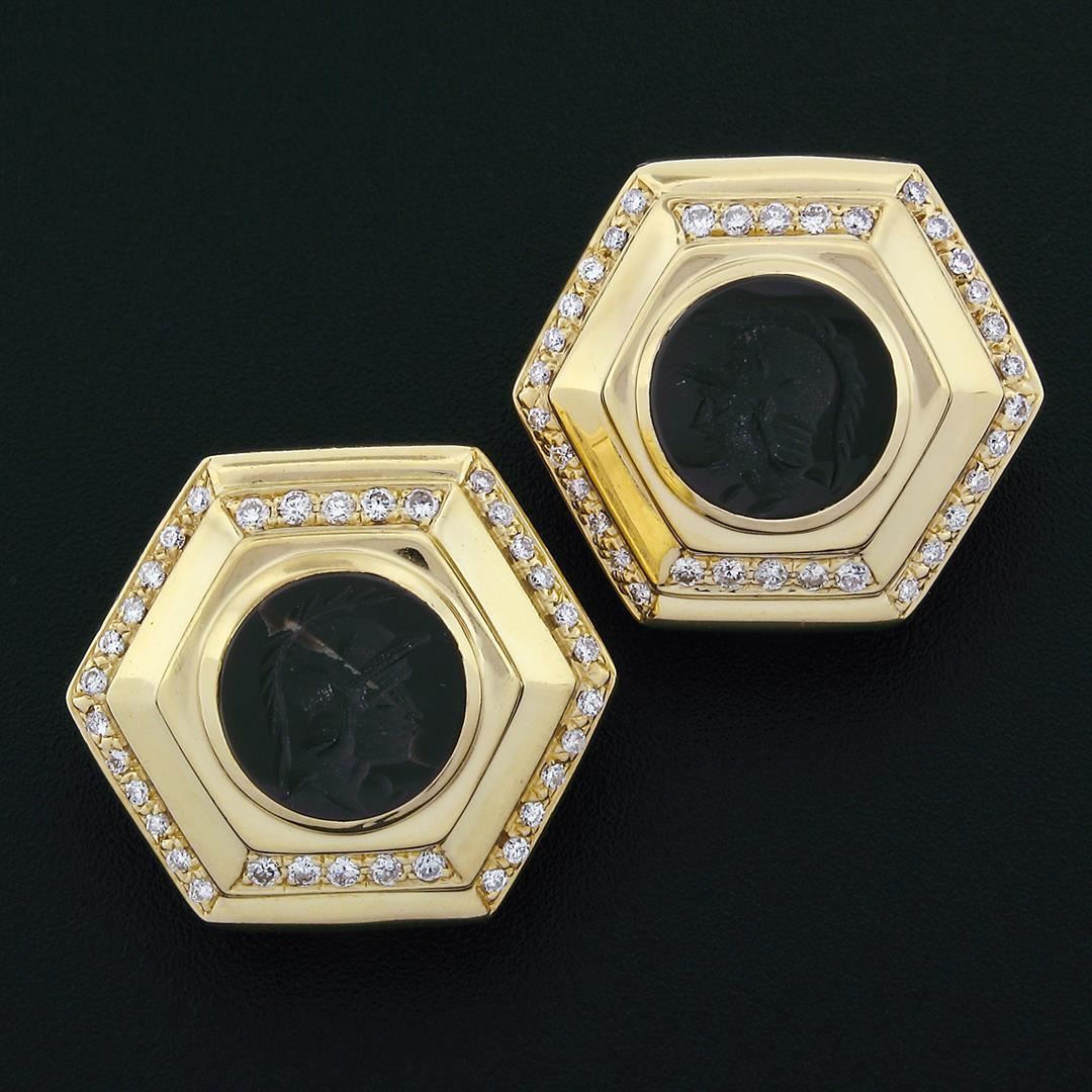 A pair of vintage solid 18k yellow gold Hexagon Earrings, with 2 carved round cut black onyx (12.9mm), and surrounded by round brilliant cut natural diamonds (F/G - VS1/VS2; 0.75ctw). The earrings measure approximately 25.82x28.69mm and weigh a total of 26.54 grams.
