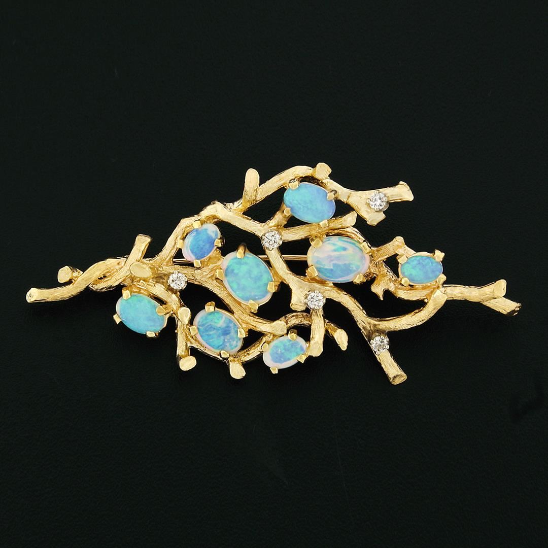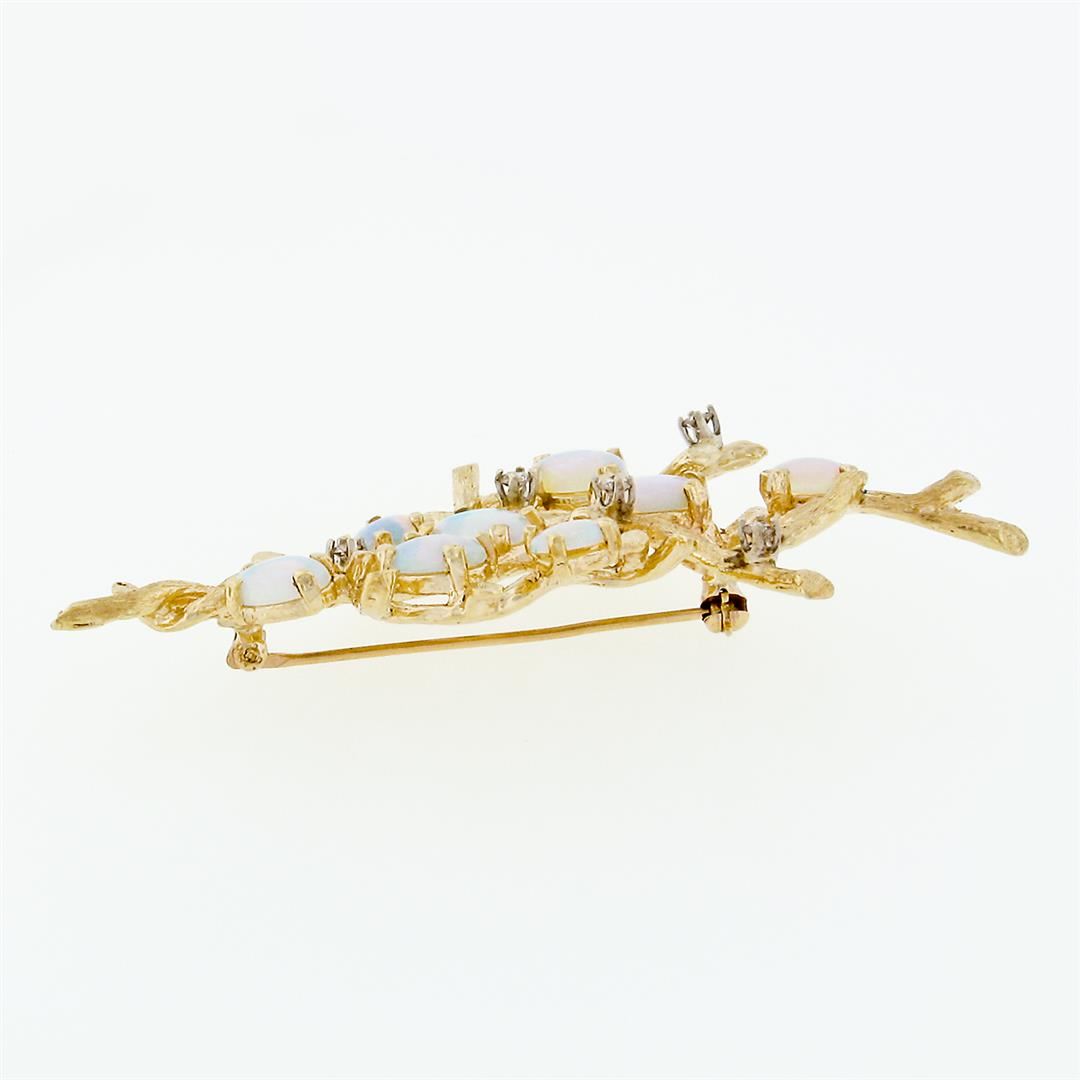 A vintage solid 14k yellow gold tree branch brooch, with 8 oval cabochon cut natural opals (5.6x3.8mm to 8.15x6mm), and 5 round brilliant cut natural diamonds (F/G - VS1/VS2; 0.20ctw). Measures 65.2x28.3mm and weighs a total of 12.80 grams.