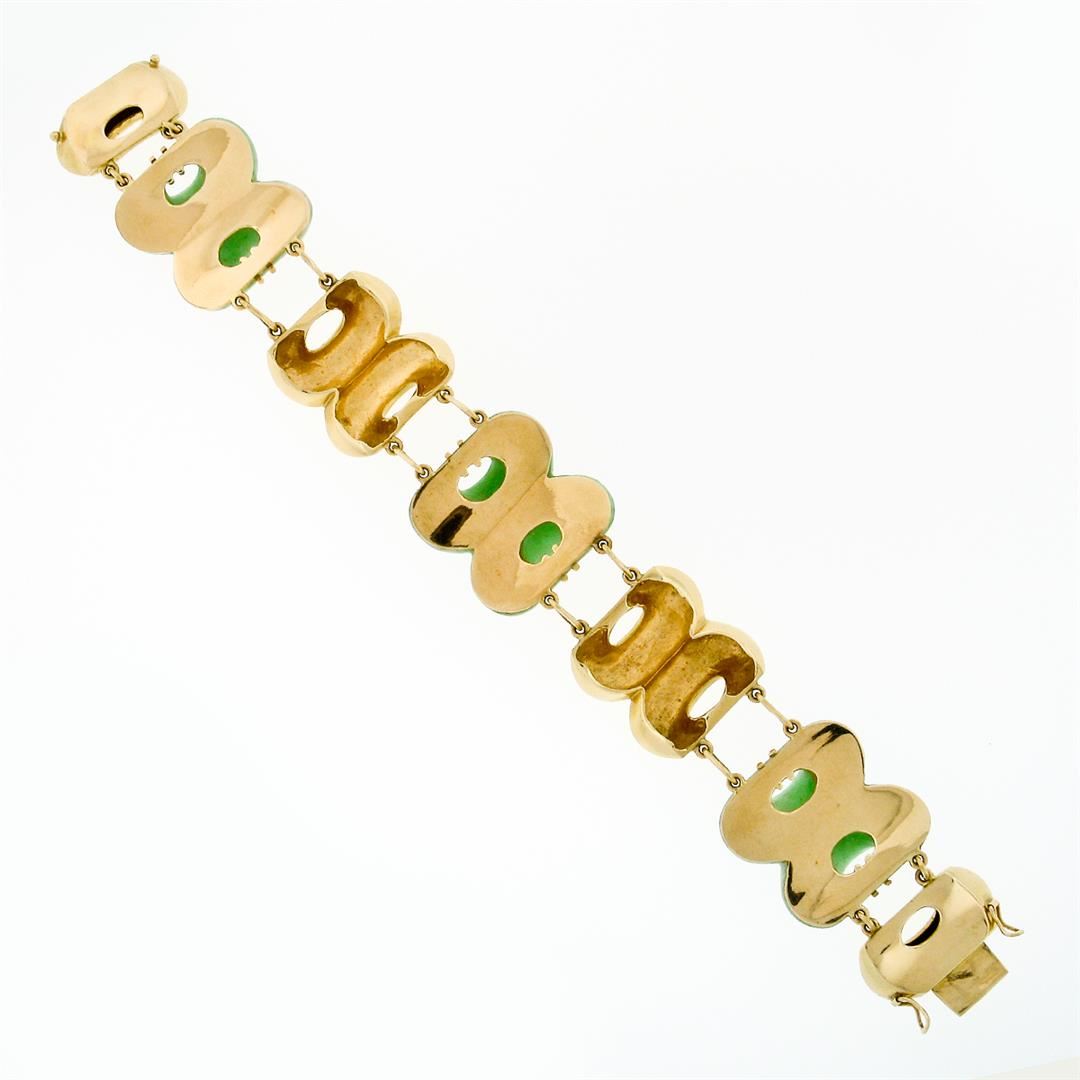 A vintage solid 14k yellow gold link bracelet with 3 custom pierced dual ring shaped natural jades (24.43x24.80mm) of a marbled green color. It weighs a total of 66.30 grams, measures 10.0mm wide, and measures 7 1/4 inches in length.