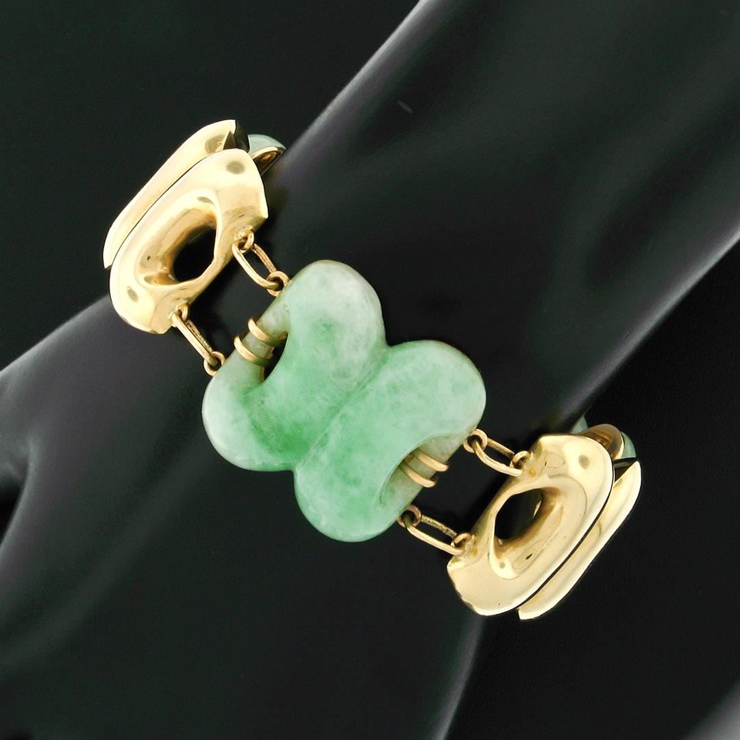 A vintage solid 14k yellow gold link bracelet with 3 custom pierced dual ring shaped natural jades (24.43x24.80mm) of a marbled green color. It weighs a total of 66.30 grams, measures 10.0mm wide, and measures 7 1/4 inches in length.