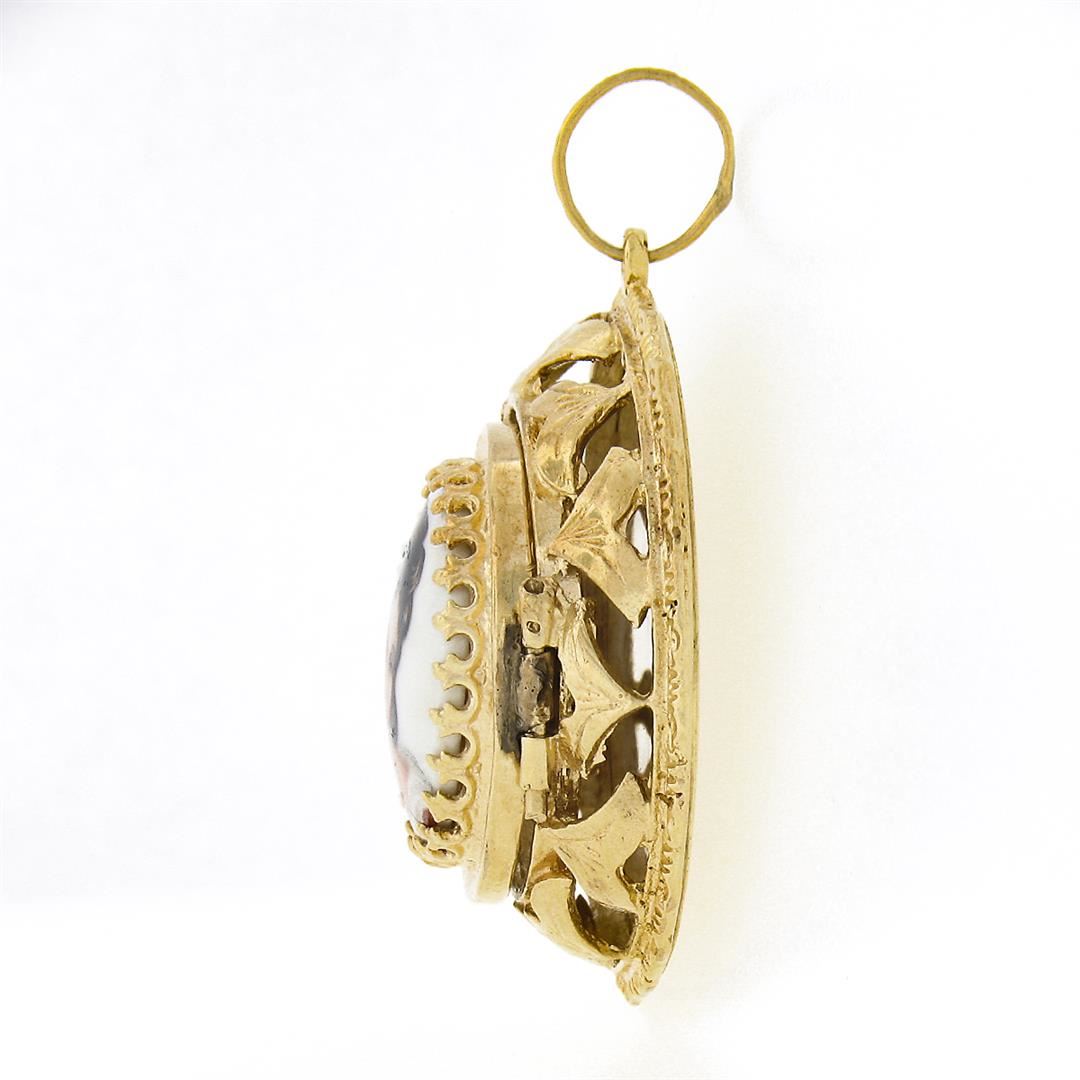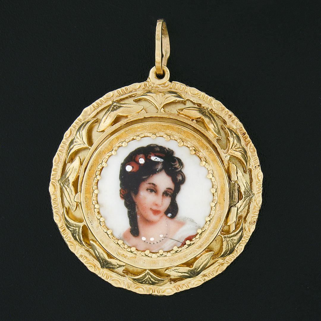 A solid 13k yellow gold limoges french painted portrait locket pendant. The pendant weighs a total of 15.0 grams, measures 43.80x34.20mm including the bail, and the inside of the bail measures 7.5mm.