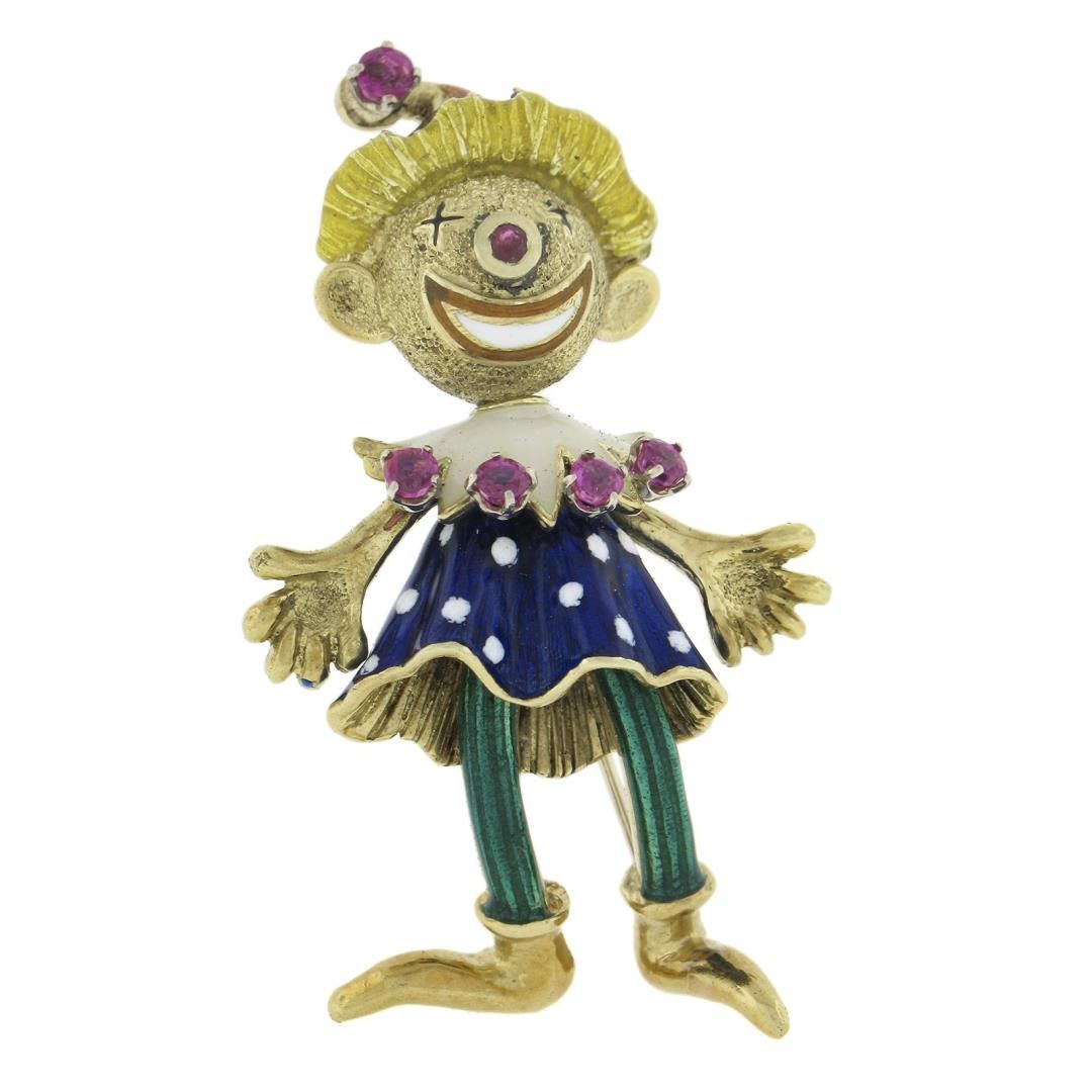 A vintage solid 18k yellow gold cown brooch, with enamel work and 6 round cut natural ruby (0.32ctw ). Measures 47.6x27.8mm and weighs a total of 18.2 grams.