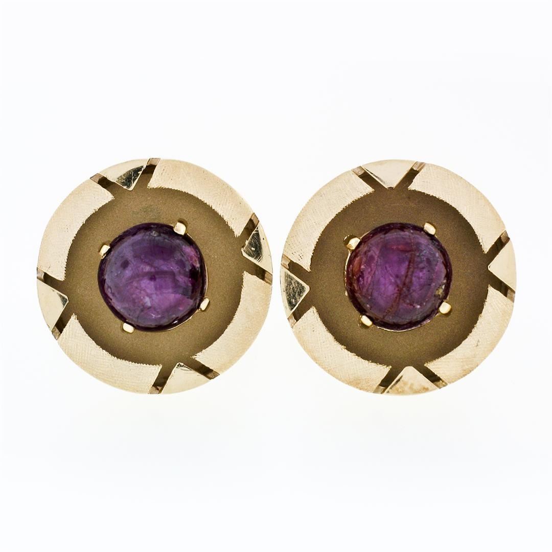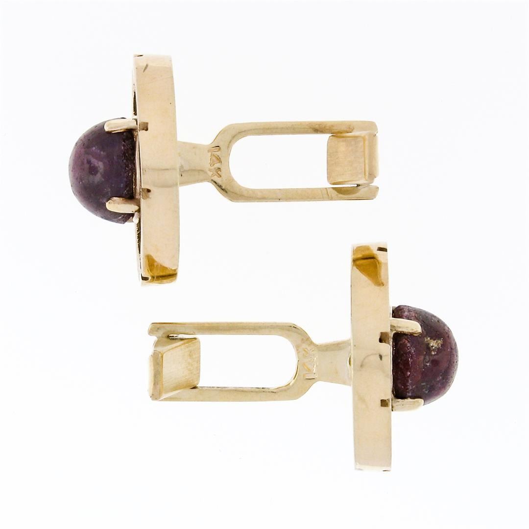 A vintage solid 14k yellow gold cufflinks, with 2 round cabochon cut natural rubies ( 8.7mm - 8.5ctw). These cuff links have a swivel design with a clearance of 14.5mm, weigh a total of 13.66 grams, and the front panels measure 19.4mm in diameter.