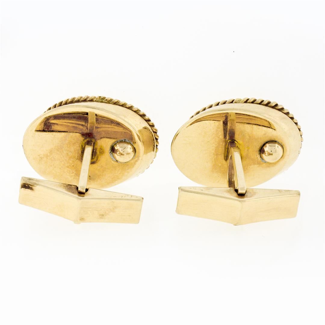 A vintage solid 14k yellow gold oval cufflinks, with 2 disc shape natural jade (8.2mm). These cuff links have a swivel design with a clearance of 9.65mm, weigh a total of 10.52 grams, and the front panels measure 20.25x14.65mm.