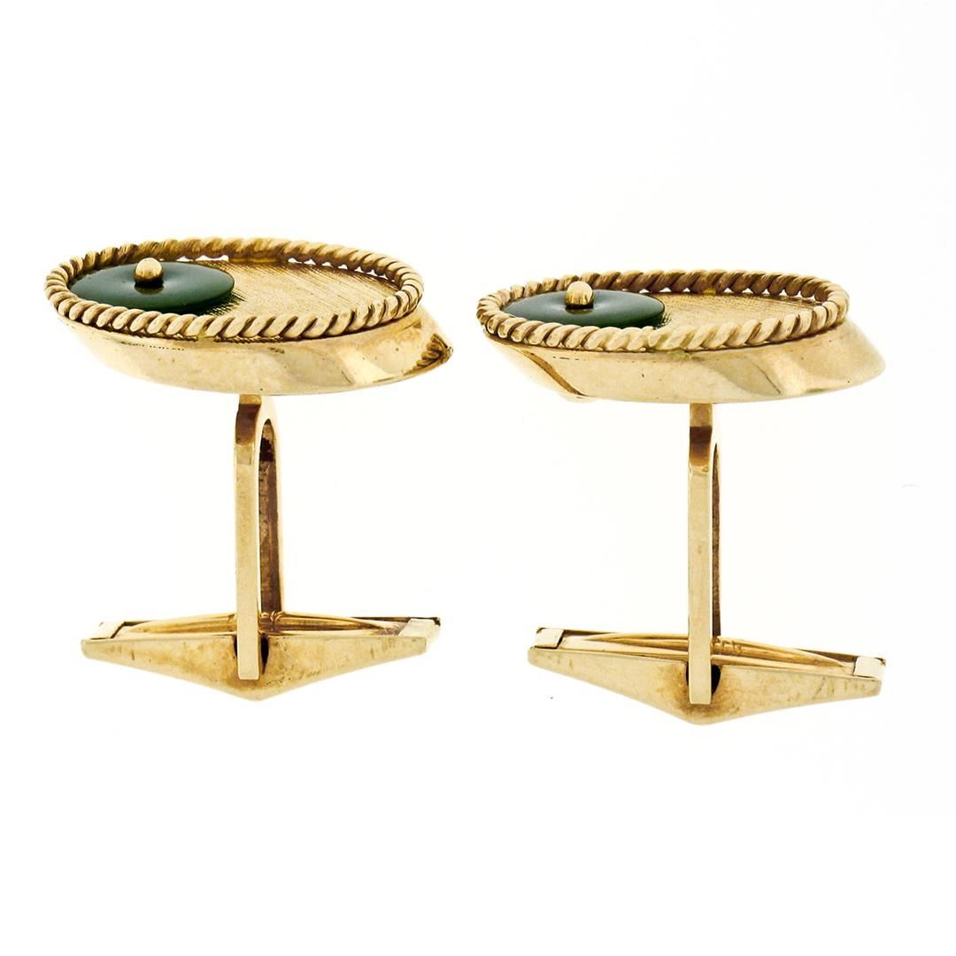 A vintage solid 14k yellow gold oval cufflinks, with 2 disc shape natural jade (8.2mm). These cuff links have a swivel design with a clearance of 9.65mm, weigh a total of 10.52 grams, and the front panels measure 20.25x14.65mm.