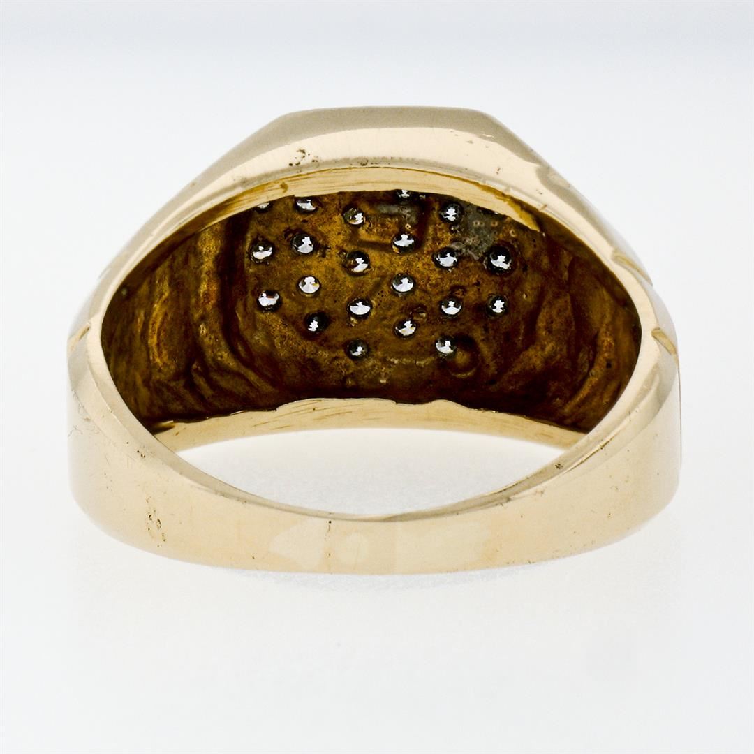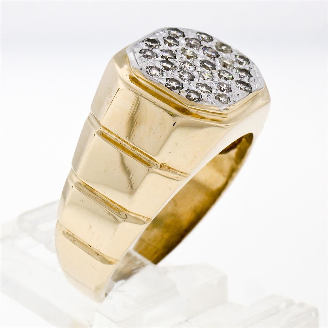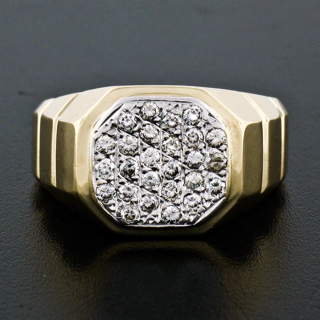 A vintage solid 14k yellow and white gold ribbed mens ring, with 26 round brilliant cut natural diamonds (G/H - VS2/SI1 ; 0.52ctw). The ring is size 9.5, weighs a total of 8.50 grams, and measures 12.90mm wide.