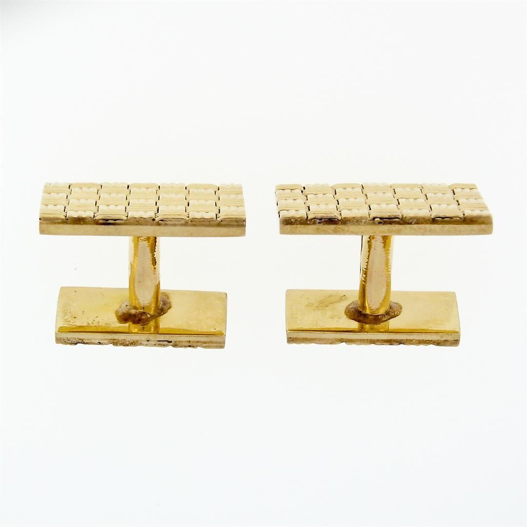 A pair solid of 14k yellow gold squared woven basket pattern work cufflinks. These cuff links have a swivel design with a clearance of 9.0mm, weigh a total of 19.57 grams, and the front panels measure 18.6x16mm.