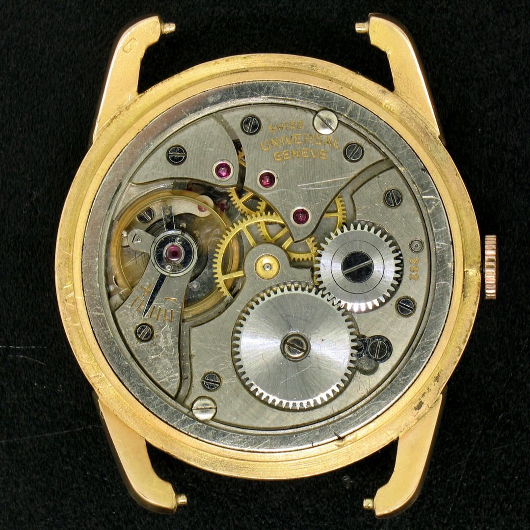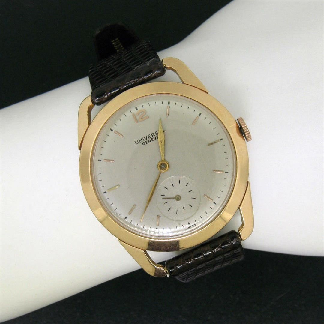 A vintage Universal Geneve men's wrist watch with a 36mm solid 18k rose gold case. Features a Swiss-made, hand winding, 17 jewel, caliber 262 movement; 100% working.