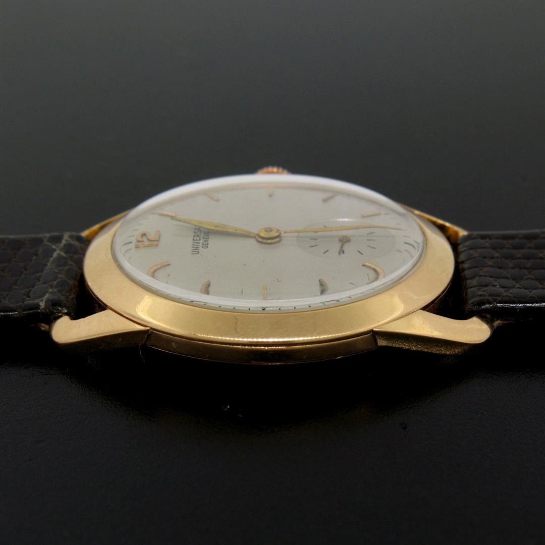 A vintage Universal Geneve men's wrist watch with a 36mm solid 18k rose gold case. Features a Swiss-made, hand winding, 17 jewel, caliber 262 movement; 100% working.