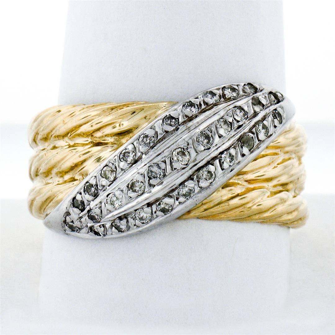 A vintage solid 14k white and yellow gold cable wide ring, with 30 round brilliant cut natural diamonds (H/I- SI1/SI2 ; 0.30ctw). The ring is size 10.5, weighs a total of 12.28 grams, and measures 13.0mm wide.