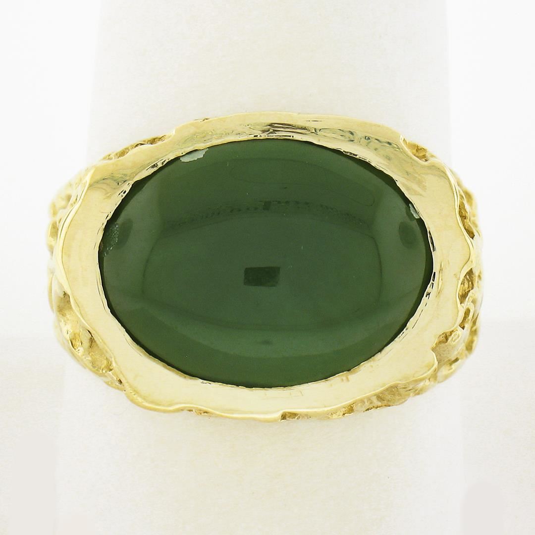 A vintage solid 14k yellow gold mens cocktail ring, with 1 oval cabochon cut natrual jade (15.2x11.5mm). The ring is size 10.0, weighs a total of 12.44 grams, and measures 14.8mm wide.