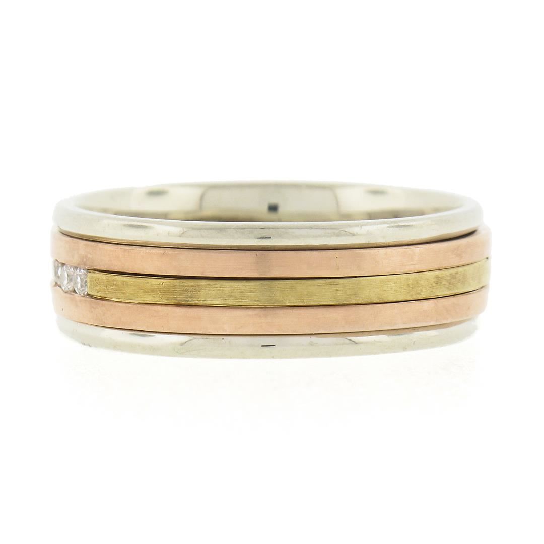 A vintage solid 14k rose, white & yellow gold ring. with 6 round brilliant cut natural diamonds (G/H - VS1/VS2 ; 0.10ctw). The ring is size 10.5, weighs a total of 9.43 grams, and measures 7.1mm wide.