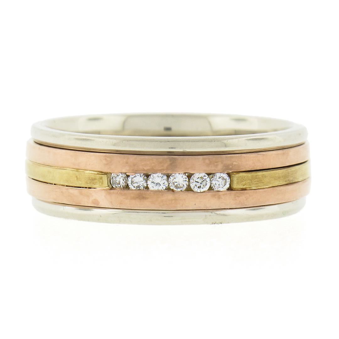 A vintage solid 14k rose, white & yellow gold ring. with 6 round brilliant cut natural diamonds (G/H - VS1/VS2 ; 0.10ctw). The ring is size 10.5, weighs a total of 9.43 grams, and measures 7.1mm wide.