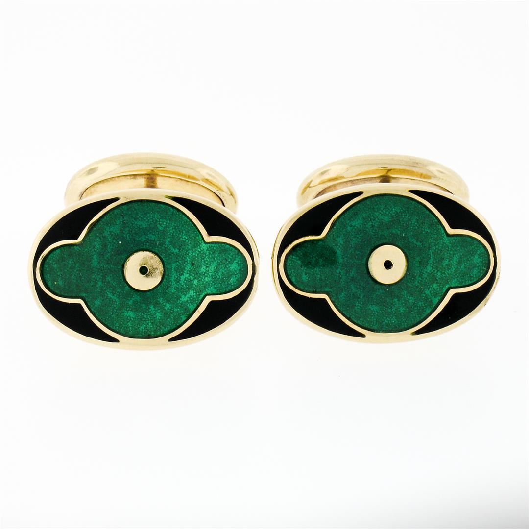 A vintage solid 18k yellow gold green black guilloche enamel cufflinks, with These cuff links have a swivel design with a clearance of 13mm, weigh a total of 16.77 grams, and the front panels measure 13.1x18.65mm.