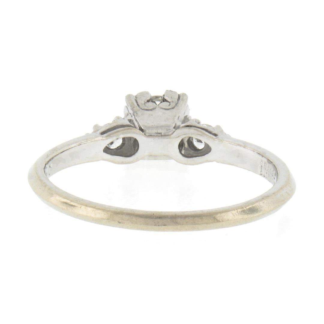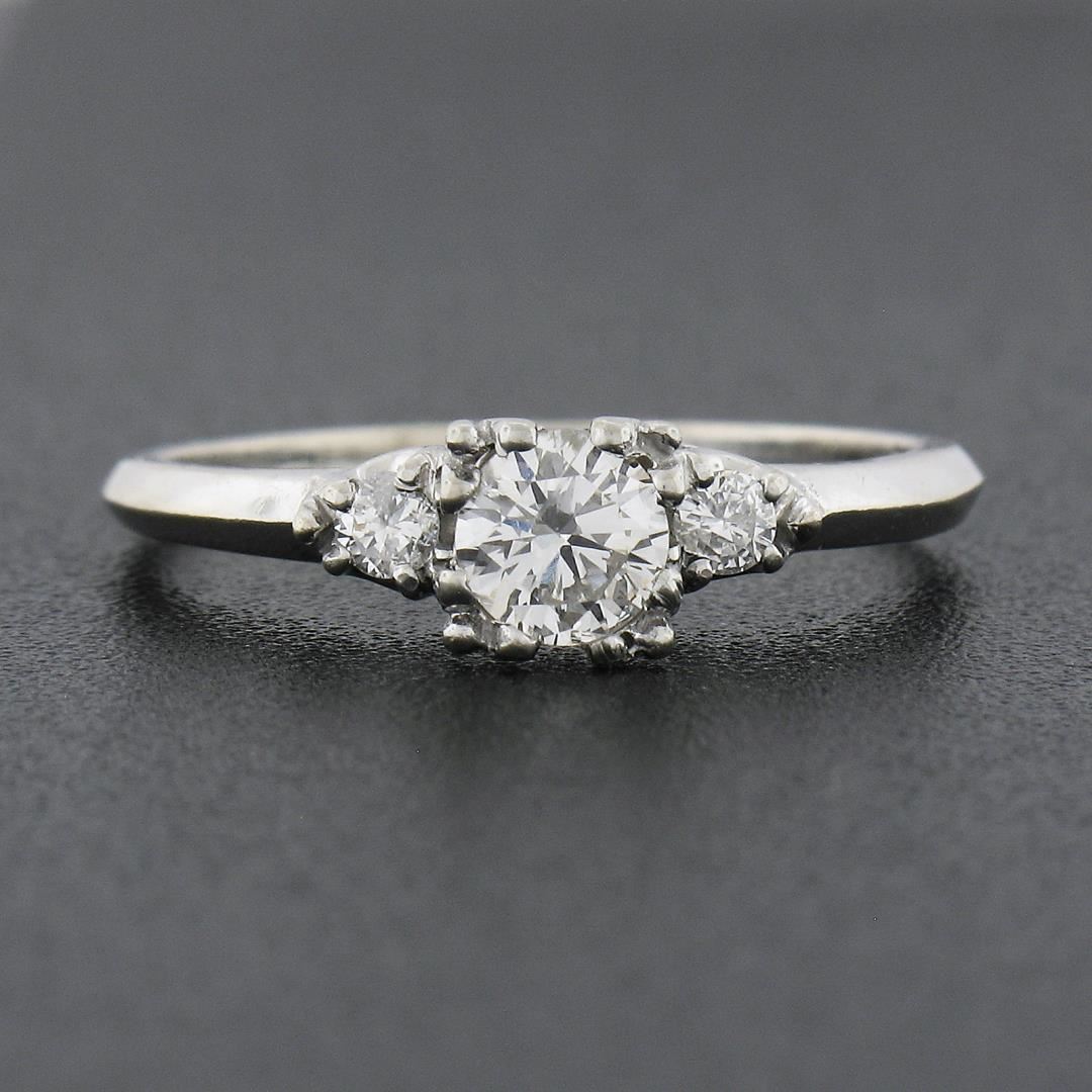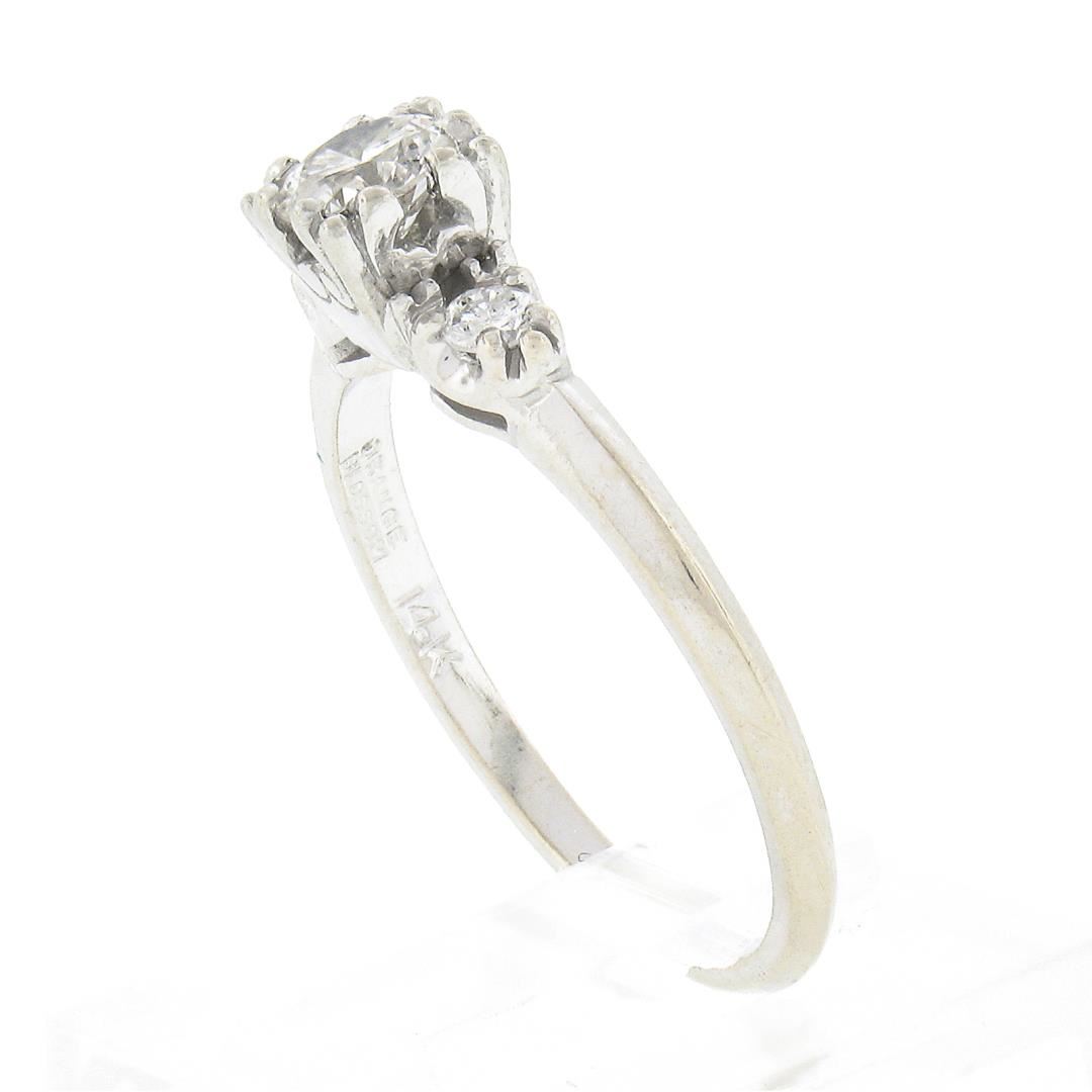 A vintage solid 14k white gold ring by Orange Blossom, with 3 old transitional cut natural diamonds (G/H - SI1/SI2 ; 0.43ctw). The ring is size 6.0, weighs a total of 2.16 grams, and measures 5.2mm wide.