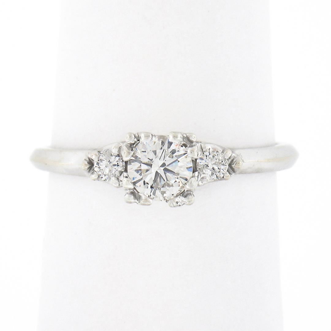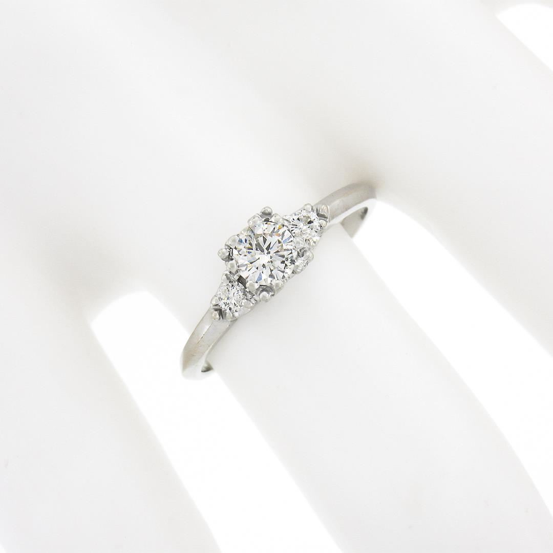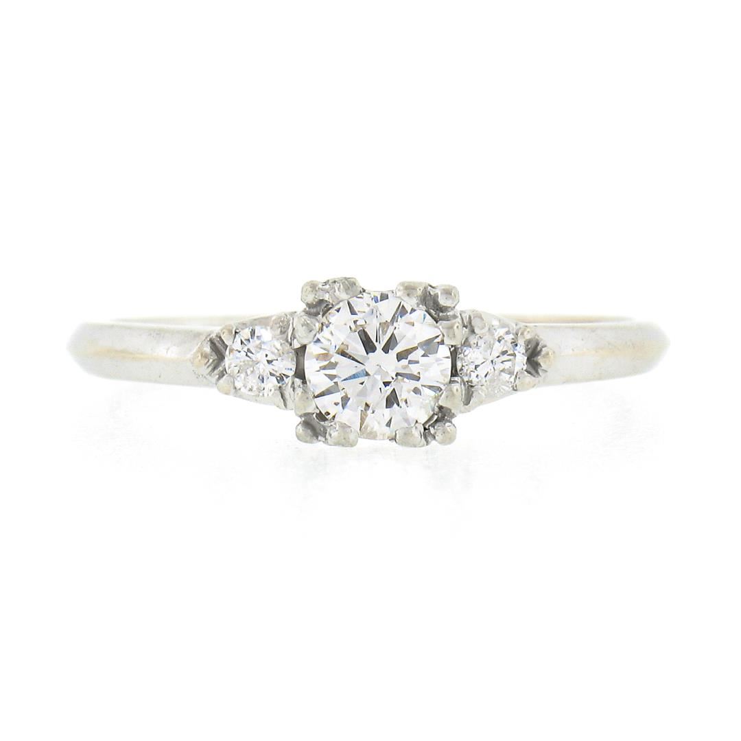 A vintage solid 14k white gold ring by Orange Blossom, with 3 old transitional cut natural diamonds (G/H - SI1/SI2 ; 0.43ctw). The ring is size 6.0, weighs a total of 2.16 grams, and measures 5.2mm wide.