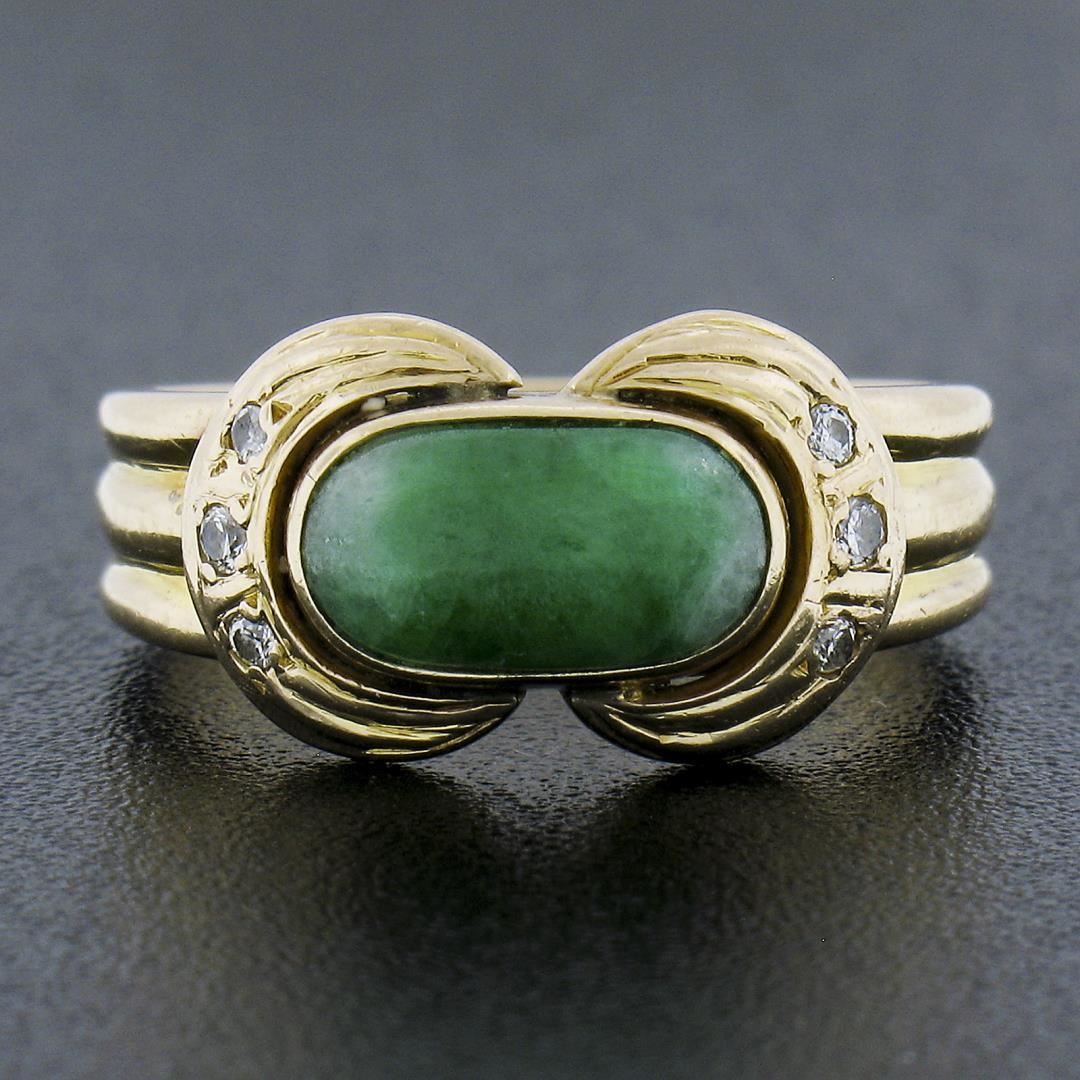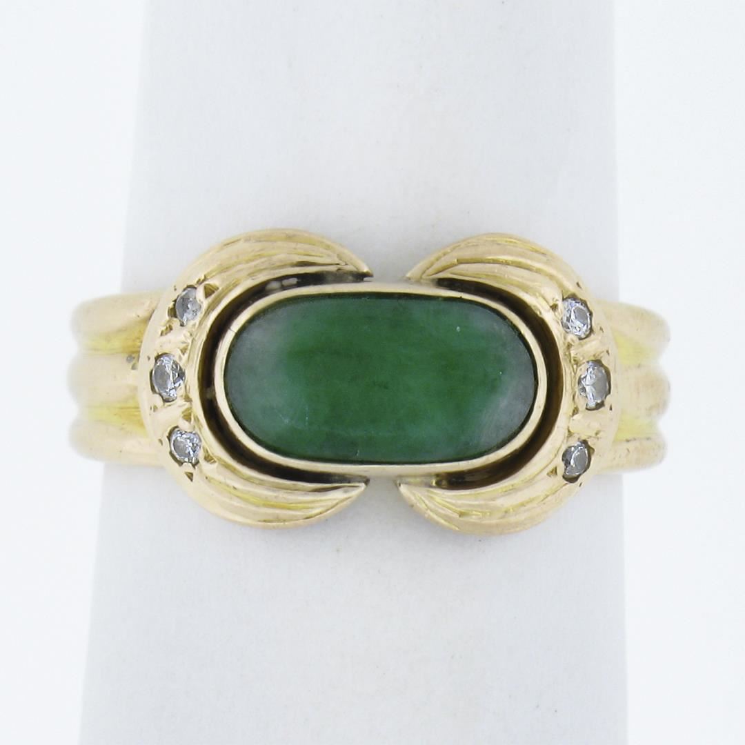 a vintage solid 14k yellow gold ring, with 1 oval cabochon cut natural jade (8.8x4.8mm), and 6 round cut natural diamonds (0.04ctw ). The ring is size 4.5, weighs a total of 4.62 grams, and measures 8.7mm wide.