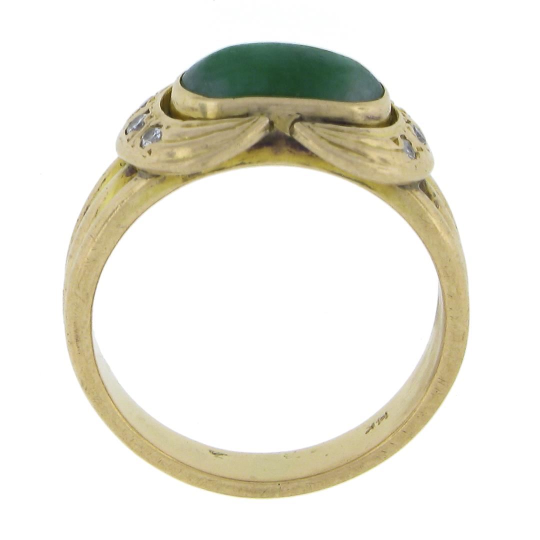 a vintage solid 14k yellow gold ring, with 1 oval cabochon cut natural jade (8.8x4.8mm), and 6 round cut natural diamonds (0.04ctw ). The ring is size 4.5, weighs a total of 4.62 grams, and measures 8.7mm wide.