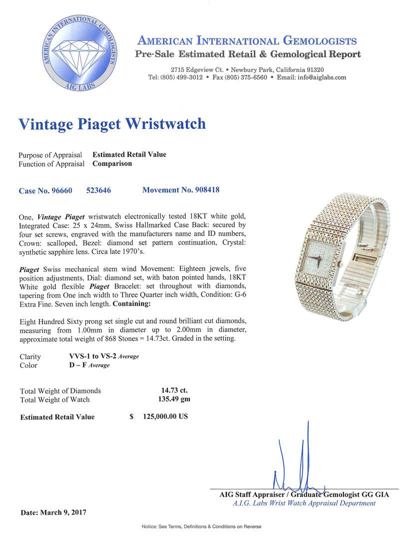 One, Vintage Piaget wristwatch electronically tested 18KT white gold, Integrated Case: 25 x 24mm, Swiss Hallmarked Case Back: secured by four set screws, engraved with the manufacturers name and ID numbers, Crown: scalloped, Bezel: diamond set pattern continuation, Crystal: synthetic sapphire lens. Circa late 1970's.Piaget Swiss mechanical stem wind Movement: Eighteen jewels, five position adjustments, Dial: diamond set, with baton pointed hands, 18KT White gold flexible Piaget Bracelet: set throughout with diamonds, tapering from One inch width to Three Quarter inch width, Condition: G-6 Extra Fine. Seven inch length. Containing: Eight Hundred Sixty prong set single cut and round brilliant cut diamonds, measuring from 1.00mm in diameter up to 2.00mm in diameter, approximate total weight of 868 Stones = 14.73ct. Graded in the setting. Clarity: VVS-1 to VS-2 Average Color D - F Average. Total Weight of Diamonds 14.73ct. Total Weight of Watch 135.49gm. AIG Appraised at $125,000.00.