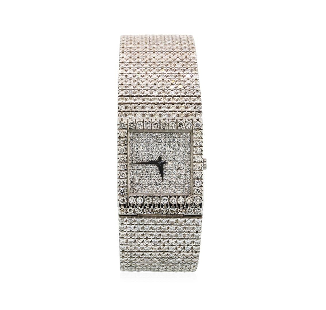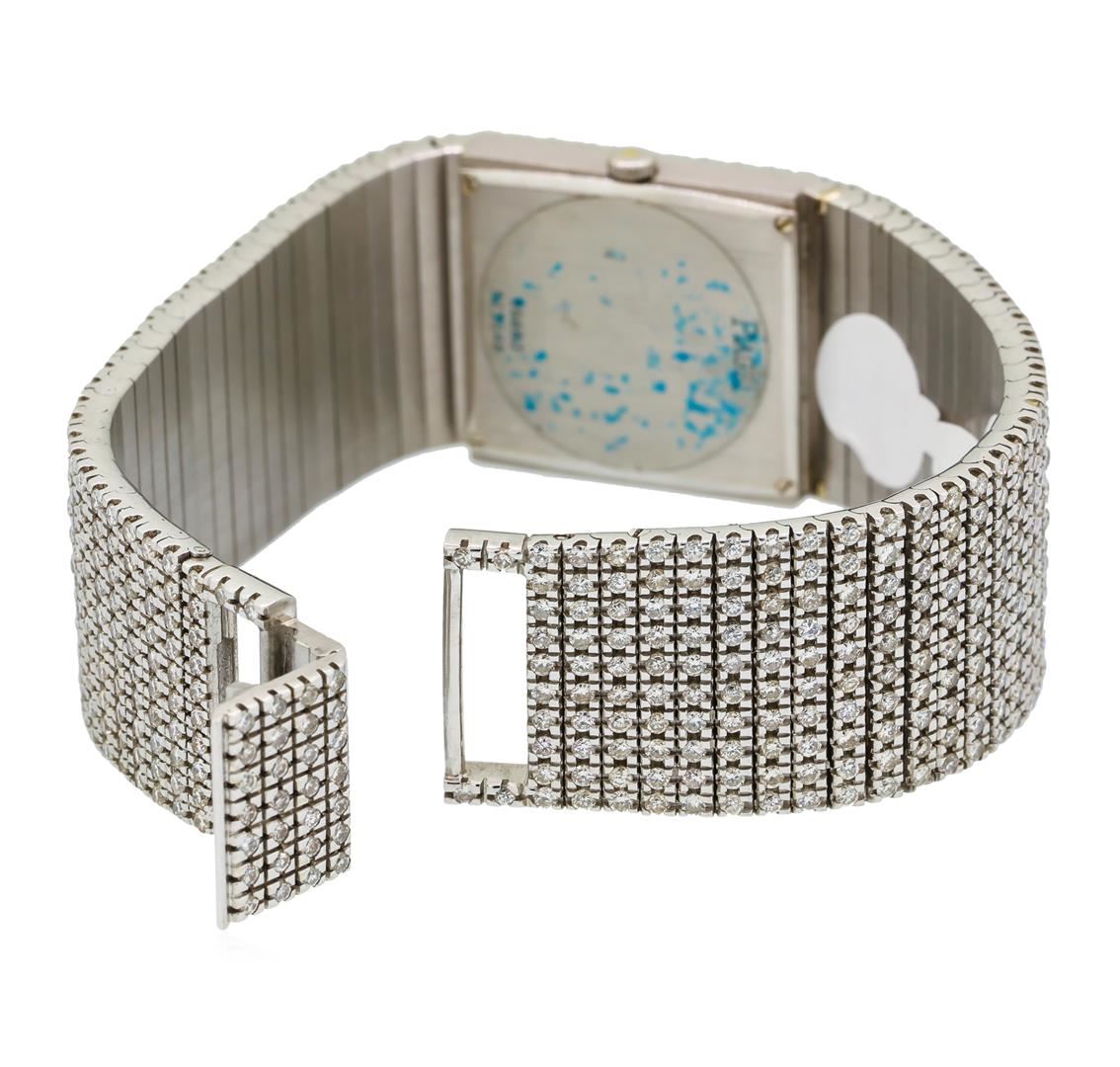 One, Vintage Piaget wristwatch electronically tested 18KT white gold, Integrated Case: 25 x 24mm, Swiss Hallmarked Case Back: secured by four set screws, engraved with the manufacturers name and ID numbers, Crown: scalloped, Bezel: diamond set pattern continuation, Crystal: synthetic sapphire lens. Circa late 1970's.Piaget Swiss mechanical stem wind Movement: Eighteen jewels, five position adjustments, Dial: diamond set, with baton pointed hands, 18KT White gold flexible Piaget Bracelet: set throughout with diamonds, tapering from One inch width to Three Quarter inch width, Condition: G-6 Extra Fine. Seven inch length. Containing: Eight Hundred Sixty prong set single cut and round brilliant cut diamonds, measuring from 1.00mm in diameter up to 2.00mm in diameter, approximate total weight of 868 Stones = 14.73ct. Graded in the setting. Clarity: VVS-1 to VS-2 Average Color D - F Average. Total Weight of Diamonds 14.73ct. Total Weight of Watch 135.49gm. AIG Appraised at $125,000.00.