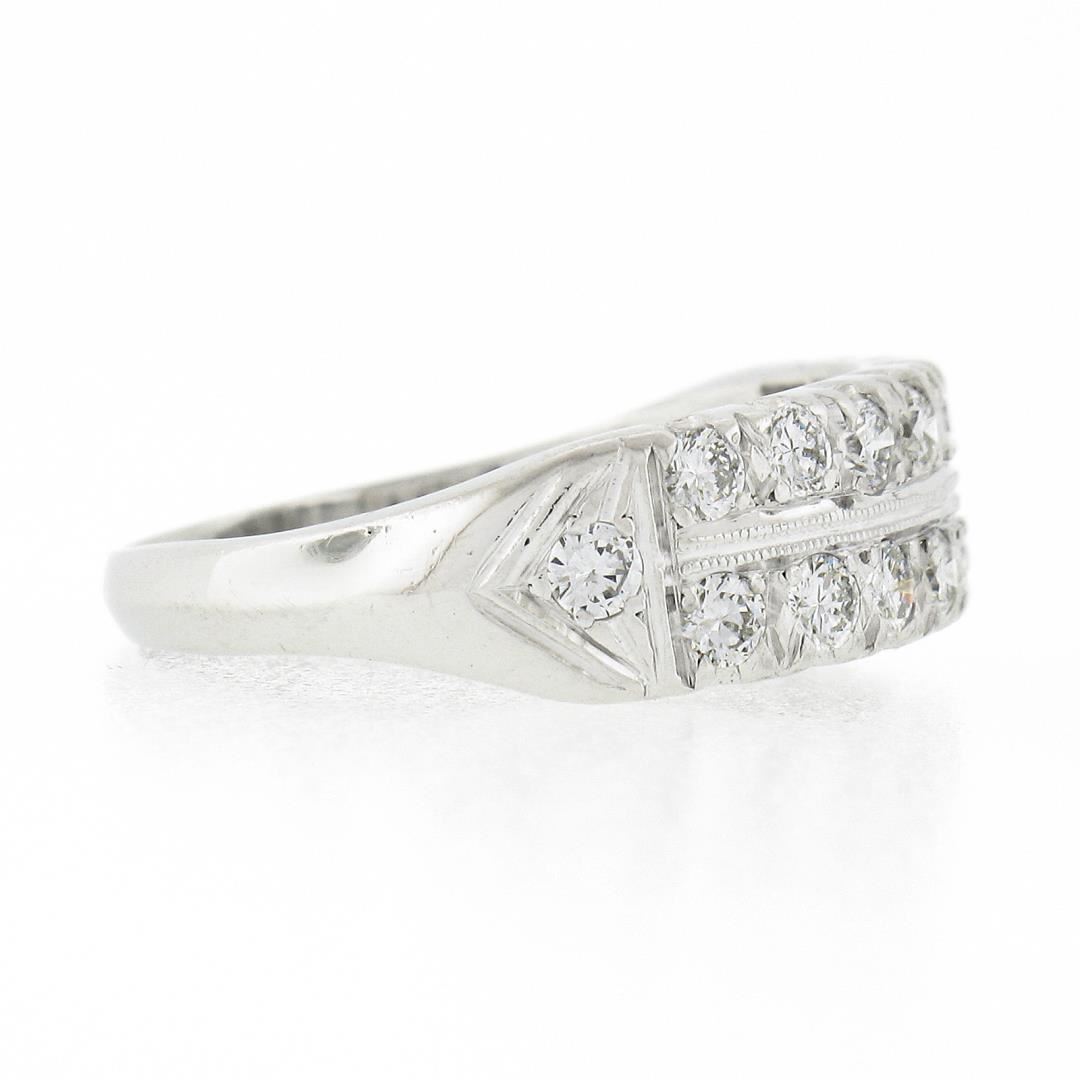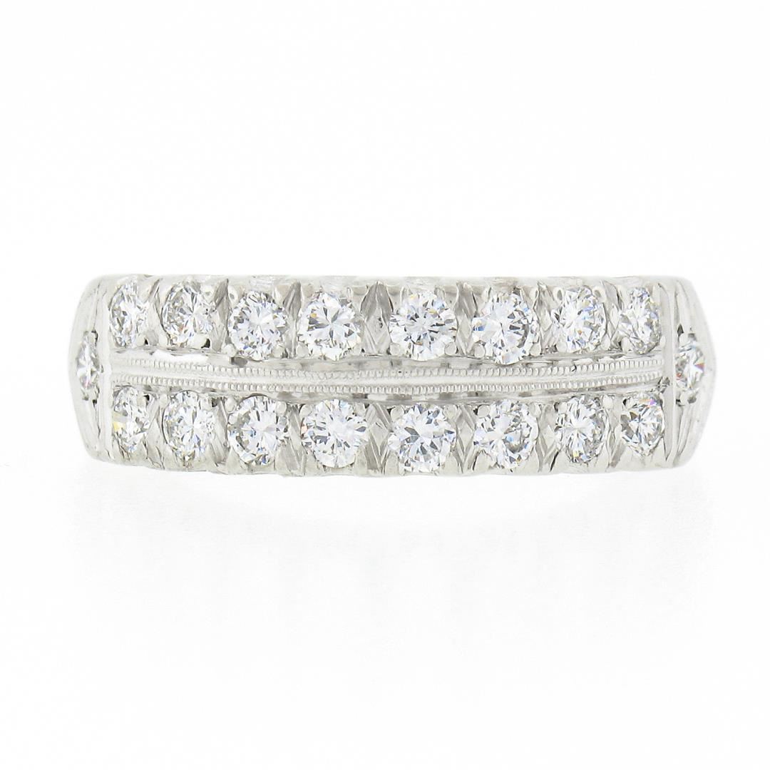 A vintage solid platinum band ring, with 18 round brilliant cut natural diamonds (F/G - VS1/VS2 ; 1ctw). The ring is size 7.5, weighs a total of 7.31 grams, and measures 6.6mm wide.
