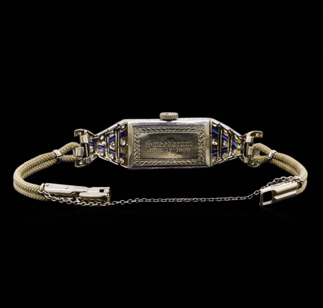 One ladies, Vintage wristwatch electronically tested Platinum, Case: 24 x 14mm, Case Back: dated and engraved, Case Lugs: diamond set, Bezel: diamond set, Crystal: domed acrylic. Movement: fifteen jewel Swiss mechanical, Dial: Ivory color, with pointed Blue steel hands, and numerals, Condition: G-4 average. Bracelet: double cord, six inch length, with a fold over snap locking clasp. Containing: Forty Eight single cut diamonds, approximate total weight = 1.02ct. Graded in the setting. Clarity: VS-1 to SI-1. Color: I - K. Total Weight of Diamonds 1.02ct. Total Weight of Watch 21.96 grams. AIG Appraised at $4,550.00.