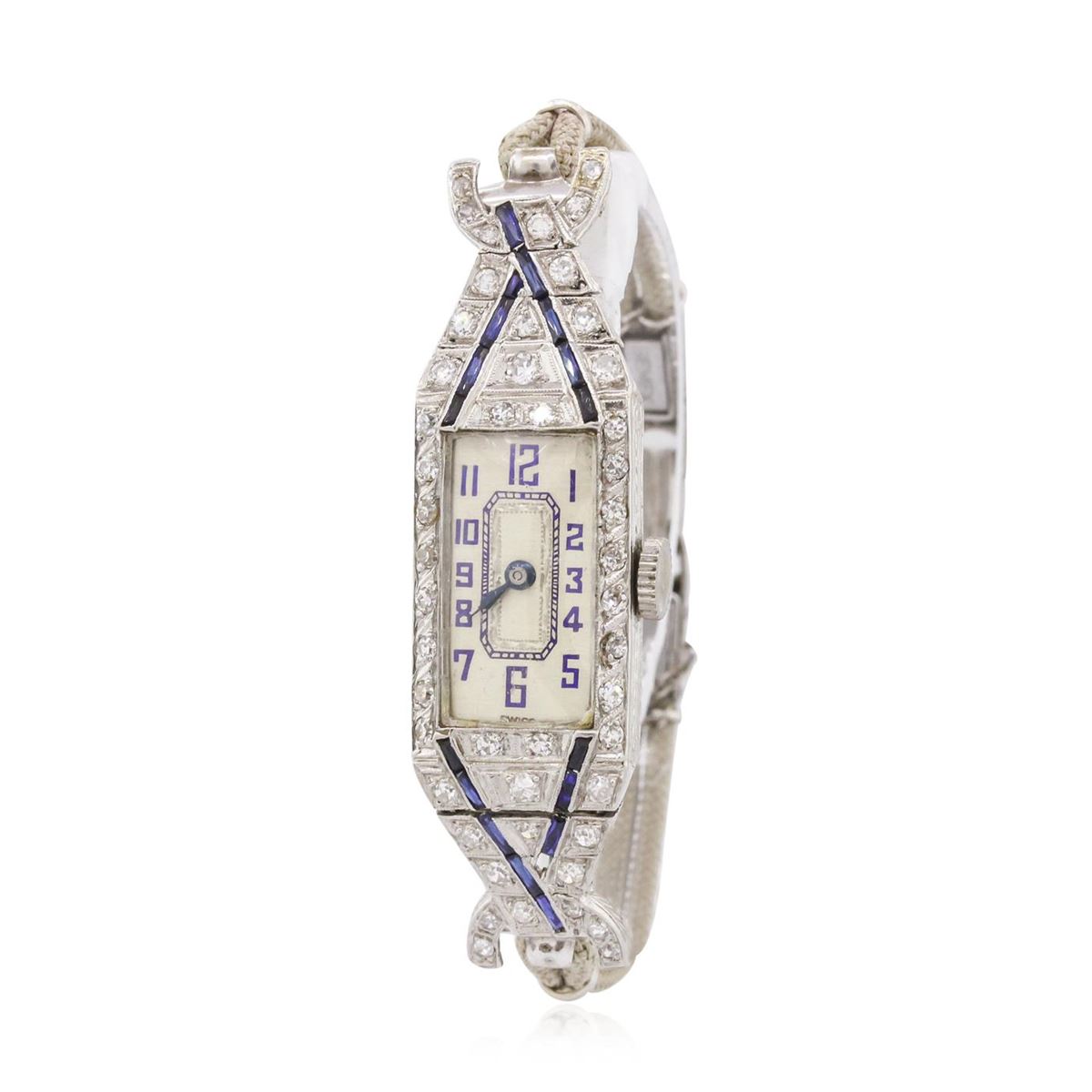 One ladies, Vintage wristwatch electronically tested Platinum, Case: 24 x 14mm, Case Back: dated and engraved, Case Lugs: diamond set, Bezel: diamond set, Crystal: domed acrylic. Movement: fifteen jewel Swiss mechanical, Dial: Ivory color, with pointed Blue steel hands, and numerals, Condition: G-4 average. Bracelet: double cord, six inch length, with a fold over snap locking clasp. Containing: Forty Eight single cut diamonds, approximate total weight = 1.02ct. Graded in the setting. Clarity: VS-1 to SI-1. Color: I - K. Total Weight of Diamonds 1.02ct. Total Weight of Watch 21.96 grams. AIG Appraised at $4,550.00.
