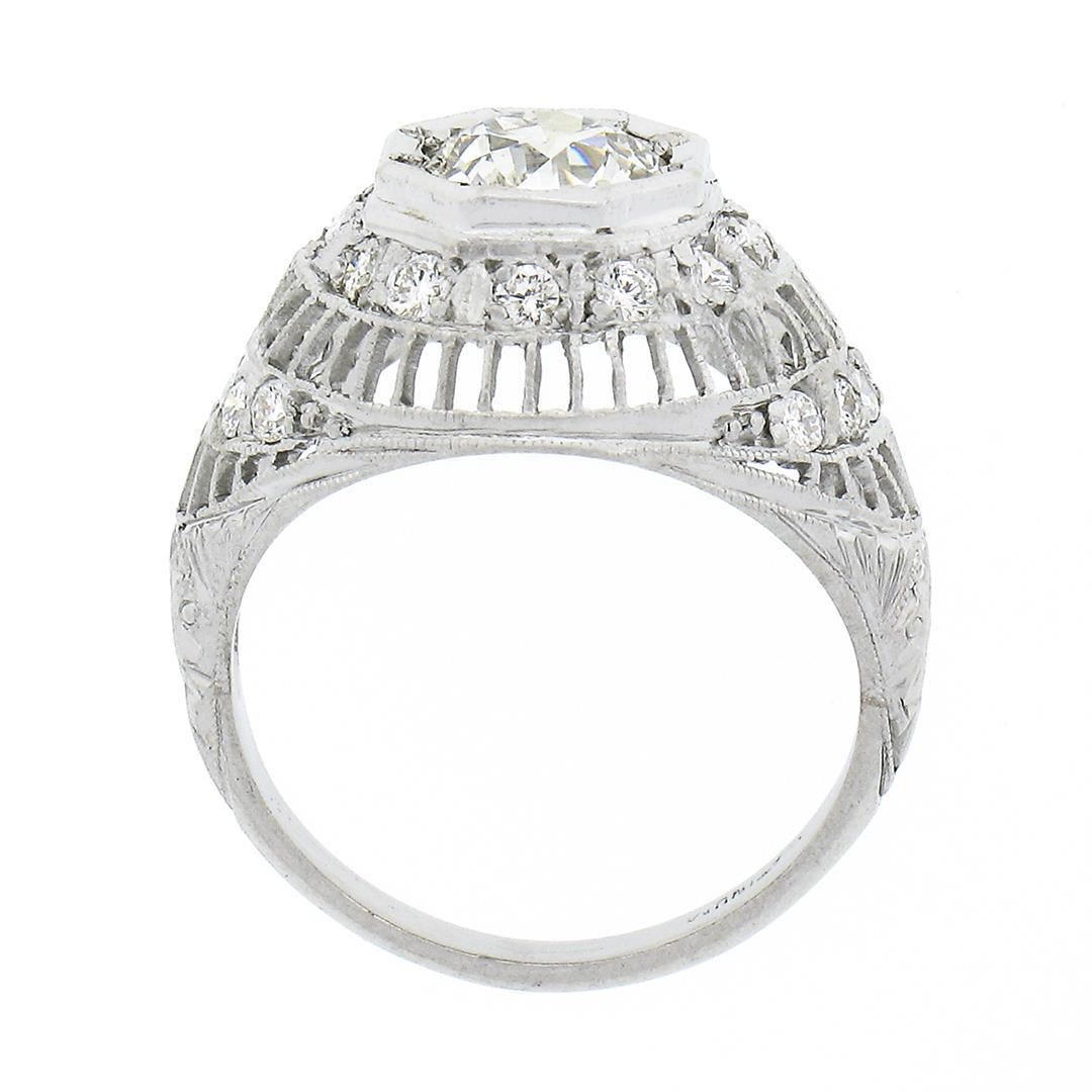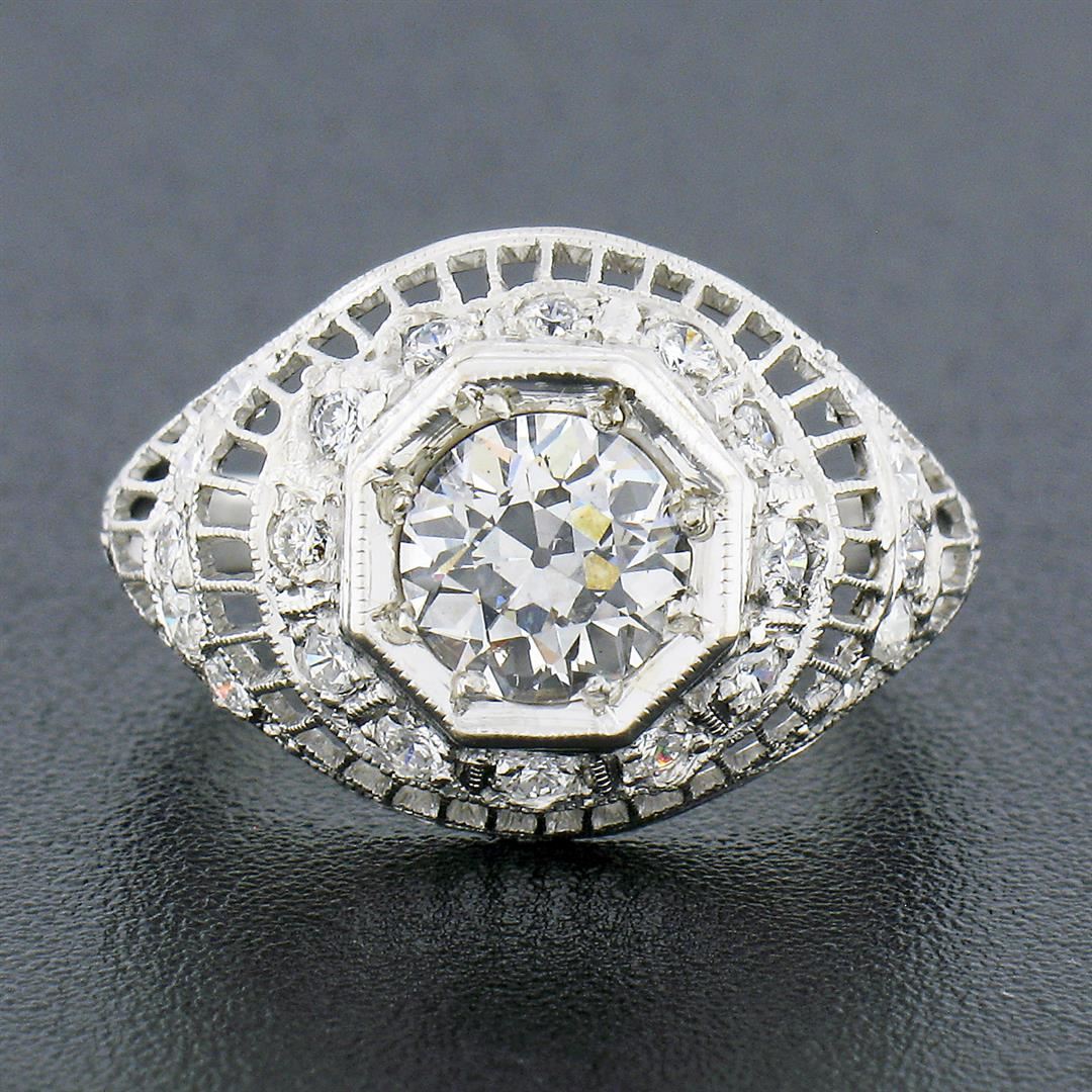 A vintage solid platinum ring, with 1 Gia certified old European cut natural diamond (0.85ct) and 22 round brilliant cut natural diamonds (G/H - VS1/VS2 ;0.36ctw). The ring is size 4.5, weighs a total of 3.85 grams, and measures 13mm wide. Comes with all original relevant certifications.
