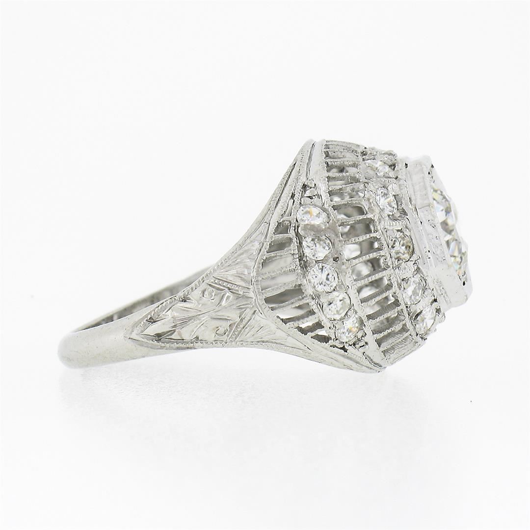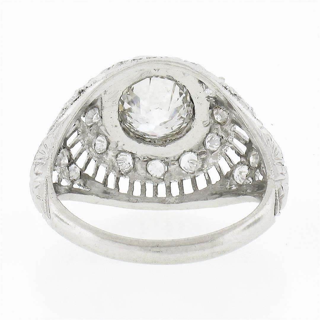 A vintage solid platinum ring, with 1 Gia certified old European cut natural diamond (0.85ct) and 22 round brilliant cut natural diamonds (G/H - VS1/VS2 ;0.36ctw). The ring is size 4.5, weighs a total of 3.85 grams, and measures 13mm wide. Comes with all original relevant certifications.