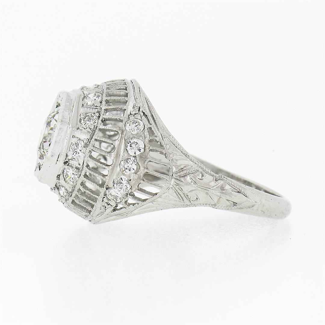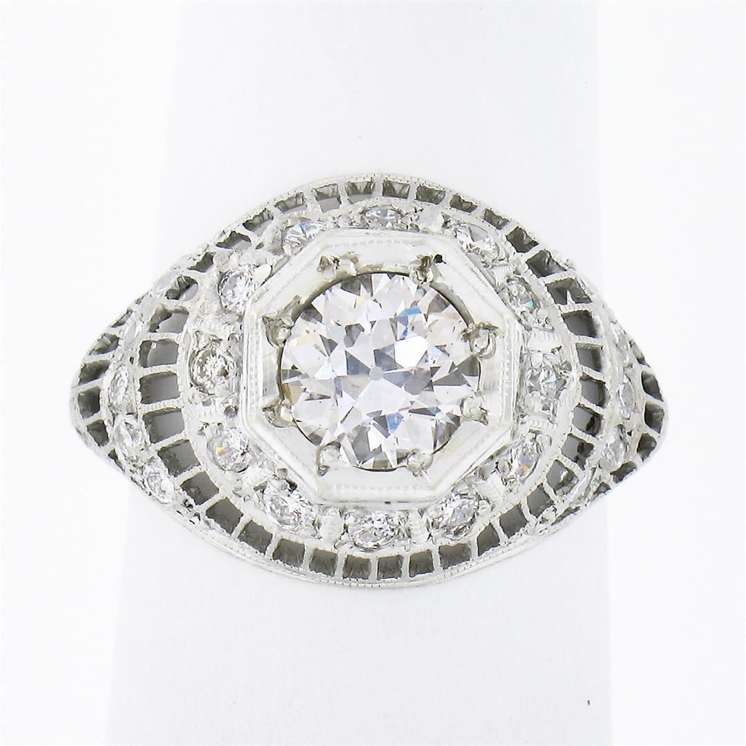 A vintage solid platinum ring, with 1 Gia certified old European cut natural diamond (0.85ct) and 22 round brilliant cut natural diamonds (G/H - VS1/VS2 ;0.36ctw). The ring is size 4.5, weighs a total of 3.85 grams, and measures 13mm wide. Comes with all original relevant certifications.