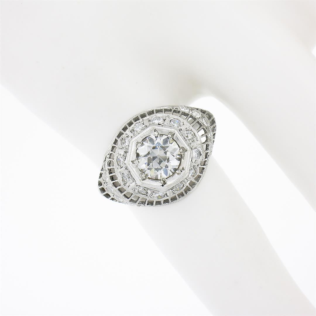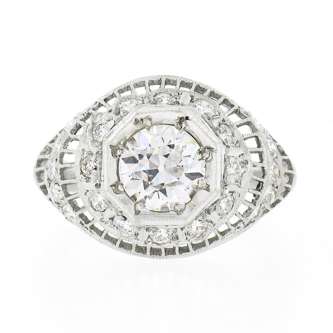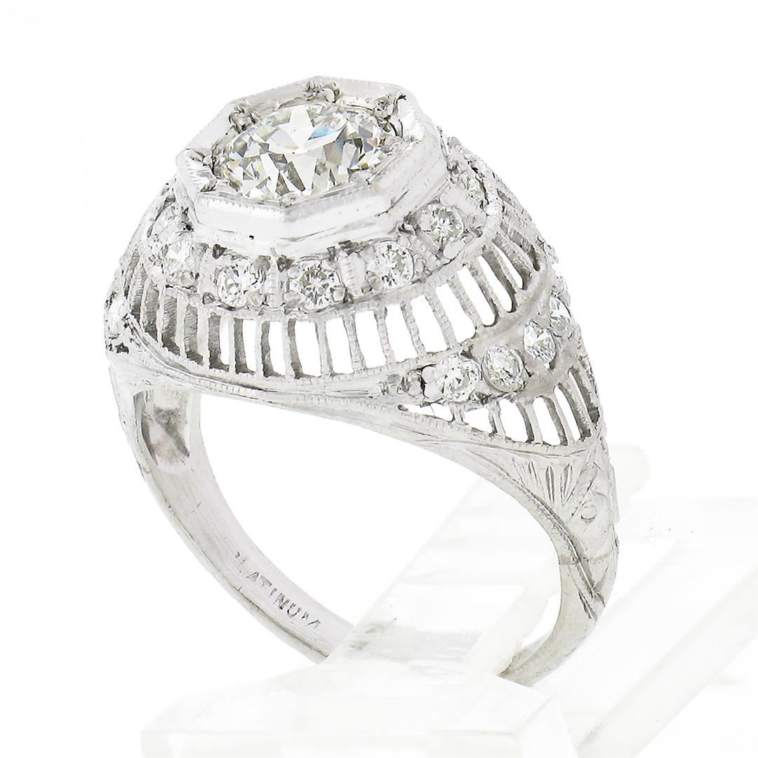 A vintage solid platinum ring, with 1 Gia certified old European cut natural diamond (0.85ct) and 22 round brilliant cut natural diamonds (G/H - VS1/VS2 ;0.36ctw). The ring is size 4.5, weighs a total of 3.85 grams, and measures 13mm wide. Comes with all original relevant certifications.