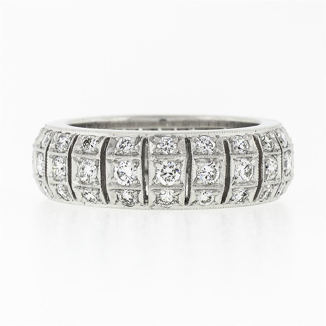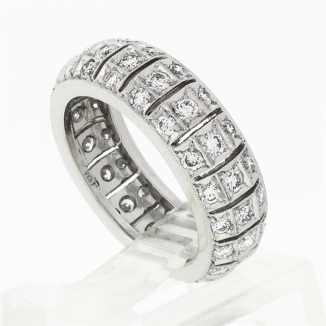 A vintage solid platinum wide eternity band ring, featuring 60 round brilliant cut natural diamonds (G/H - VS1/VS2 ; 1.30ctw). The ring is size 6, weighs a total of 8.86 grams, and measures 6.25mm wide.