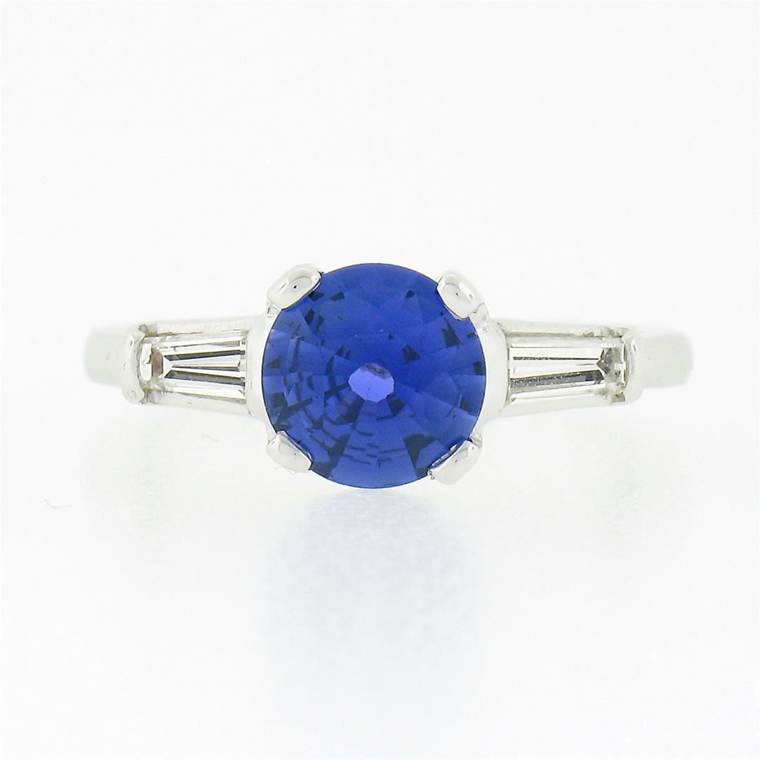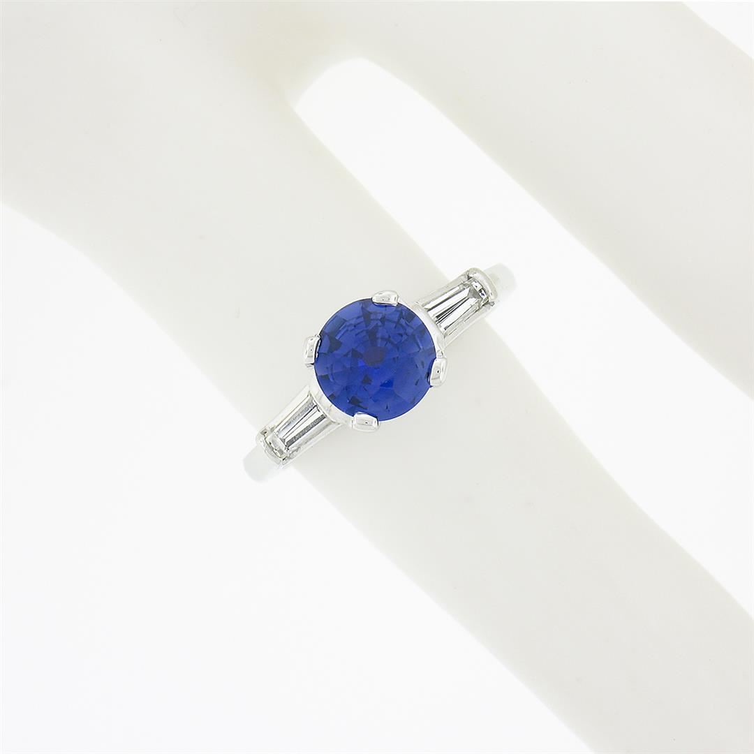 A solid platinum engagement ring, with 1 round cut natural blue sapphire (1.04ct), and 2 tapered baguette cut natural diamonds (H/I - VS1/VS2 ; 0.44ctw). The ring is size 4.0, weighs a total of 4.57 grams, and measures 6.70mm wide
