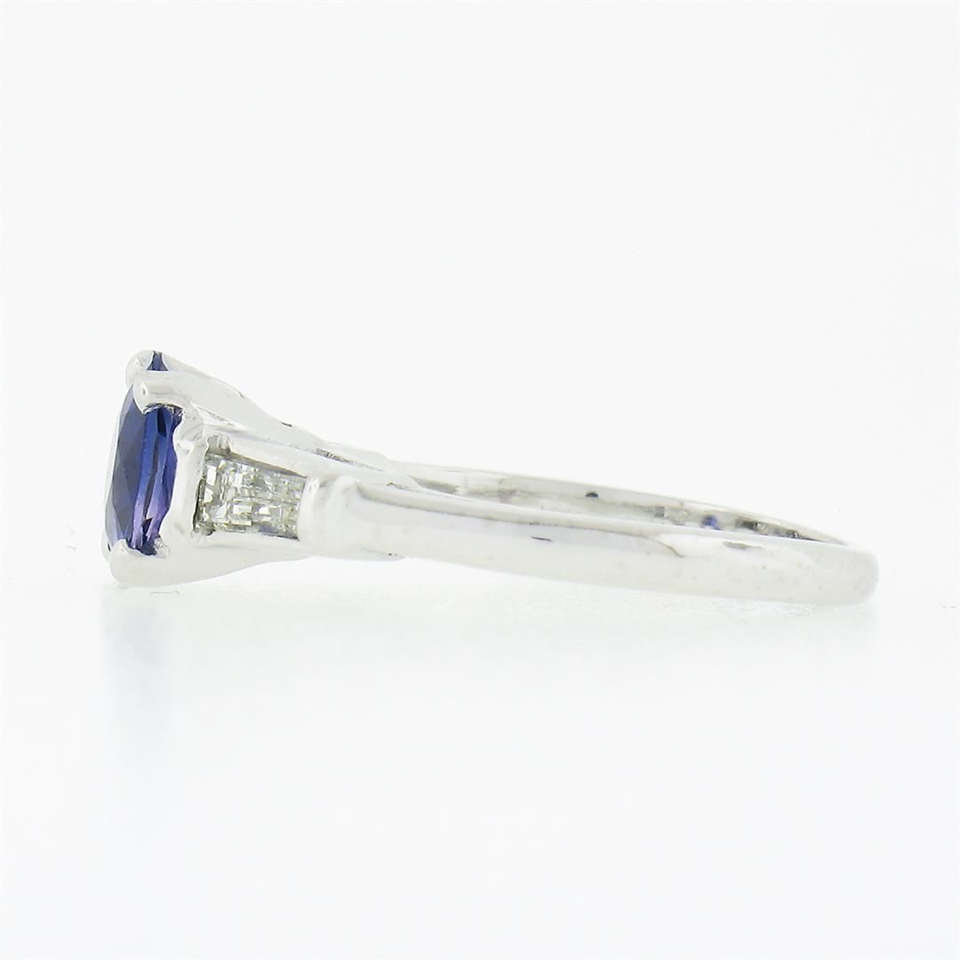 A solid platinum engagement ring, with 1 round cut natural blue sapphire (1.04ct), and 2 tapered baguette cut natural diamonds (H/I - VS1/VS2 ; 0.44ctw). The ring is size 4.0, weighs a total of 4.57 grams, and measures 6.70mm wide