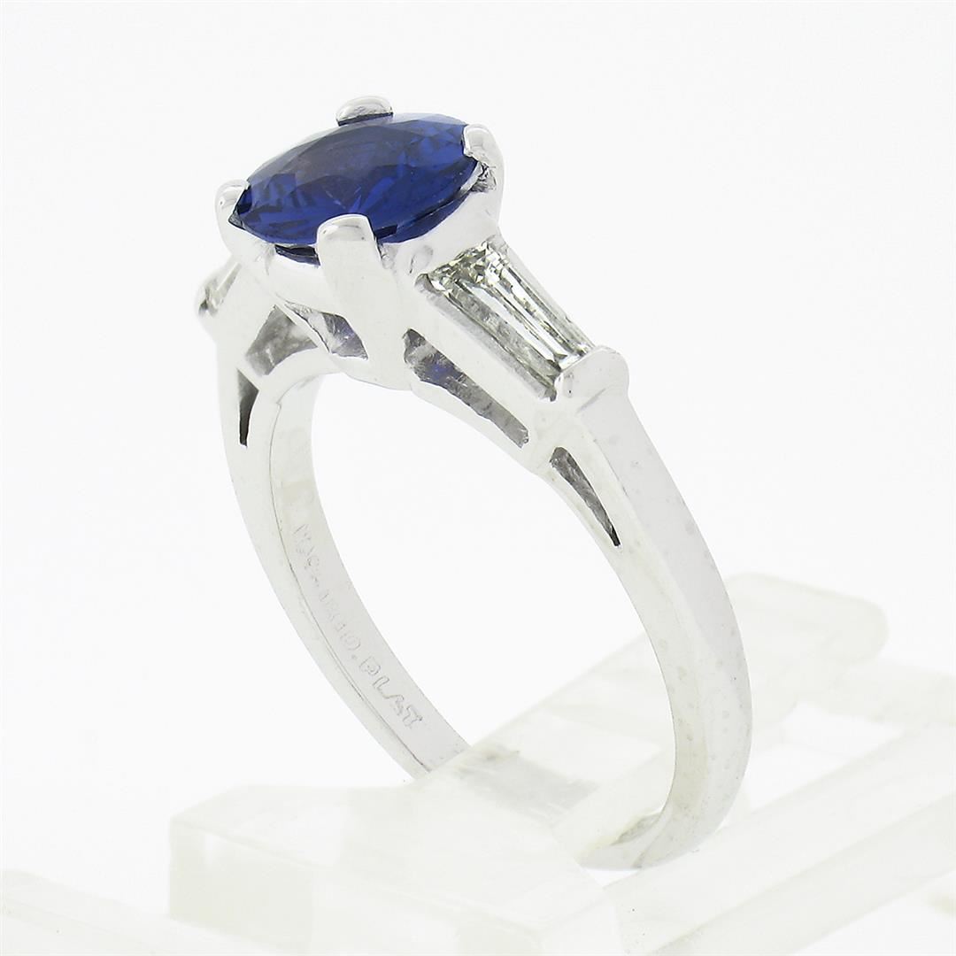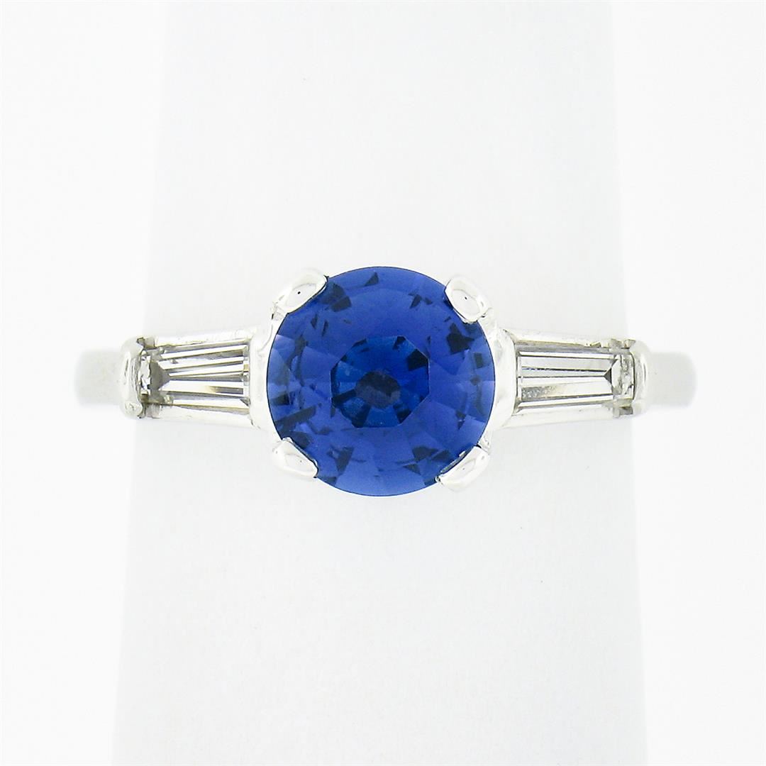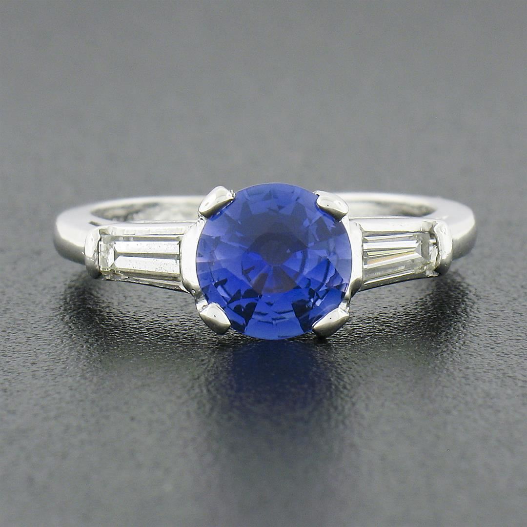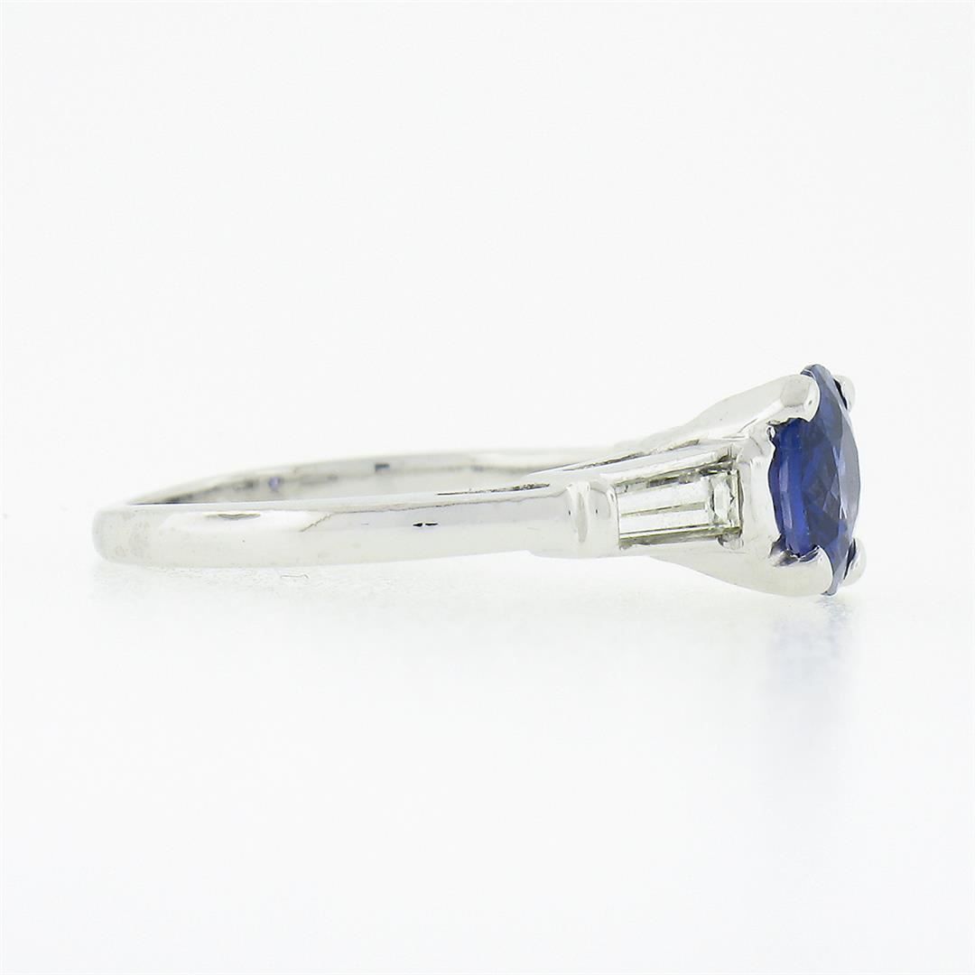A solid platinum engagement ring, with 1 round cut natural blue sapphire (1.04ct), and 2 tapered baguette cut natural diamonds (H/I - VS1/VS2 ; 0.44ctw). The ring is size 4.0, weighs a total of 4.57 grams, and measures 6.70mm wide