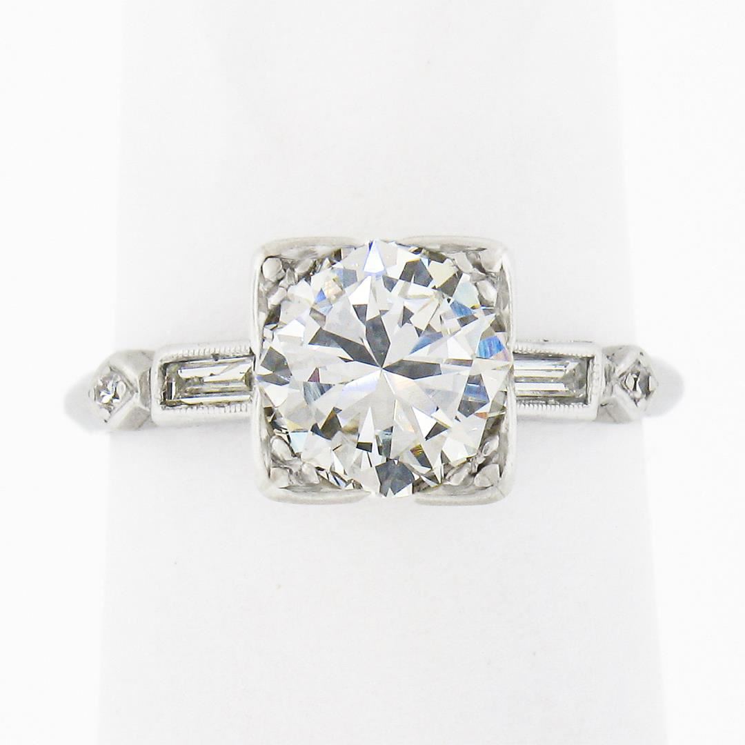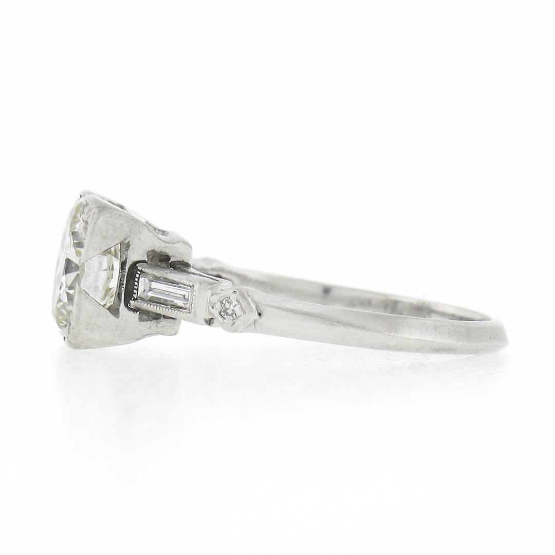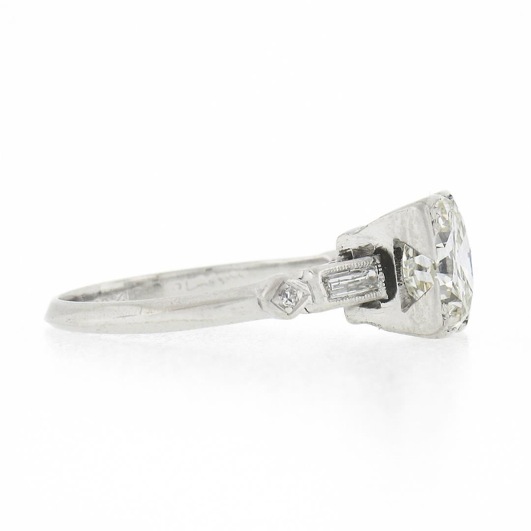 A vintage platinum engagement ring, w/ 1 old transitional cut natural diamond (I - VVS2 ; 1.33ct), 2 straight baguette cut natural diamonds (H/I - VS1/VS2 ; 0.14ctw), and 2 old single cut natural diamonds (G/H - VS1/VS2 ; 0.03ctw ). The ring is size 5.0, weighs a total of 2.90 grams, and measures 7.4mm wide.