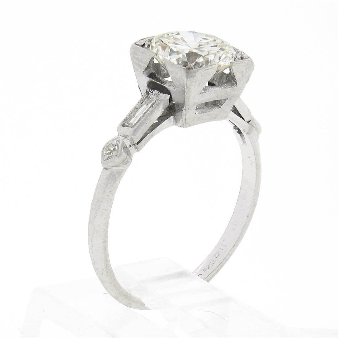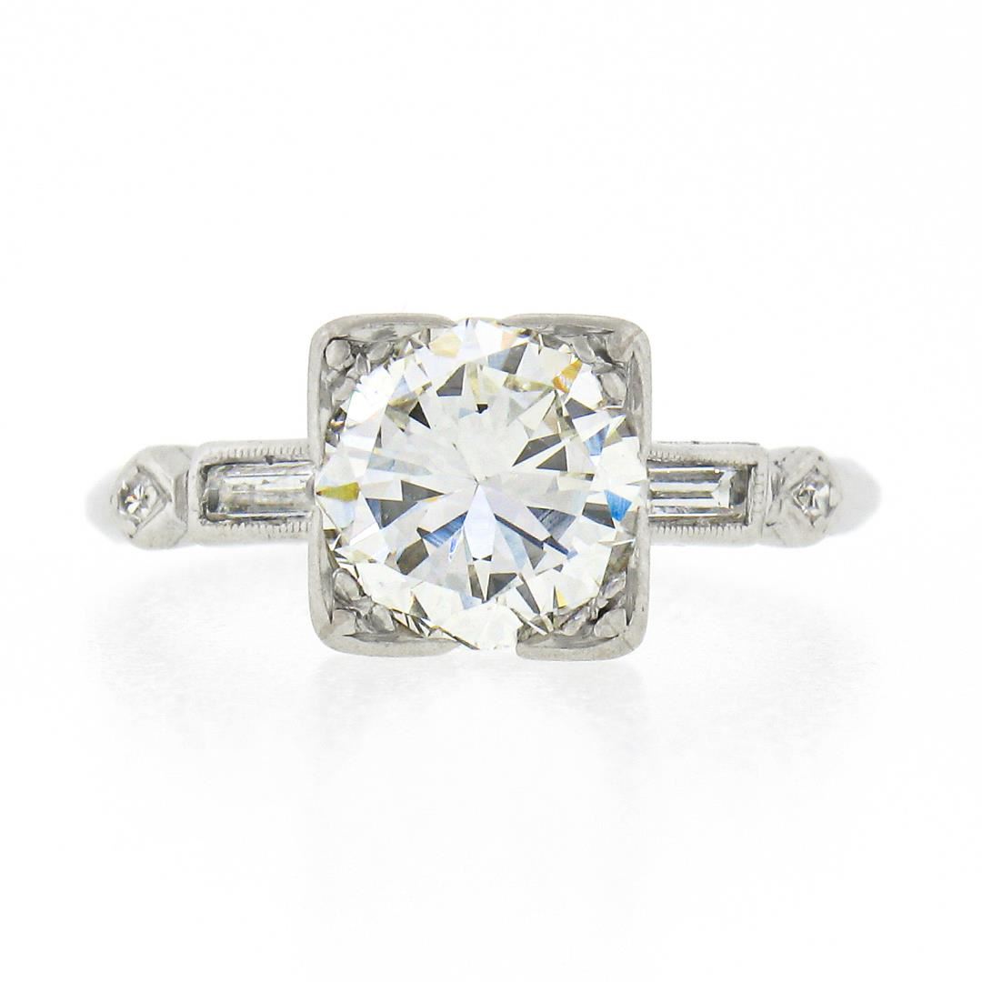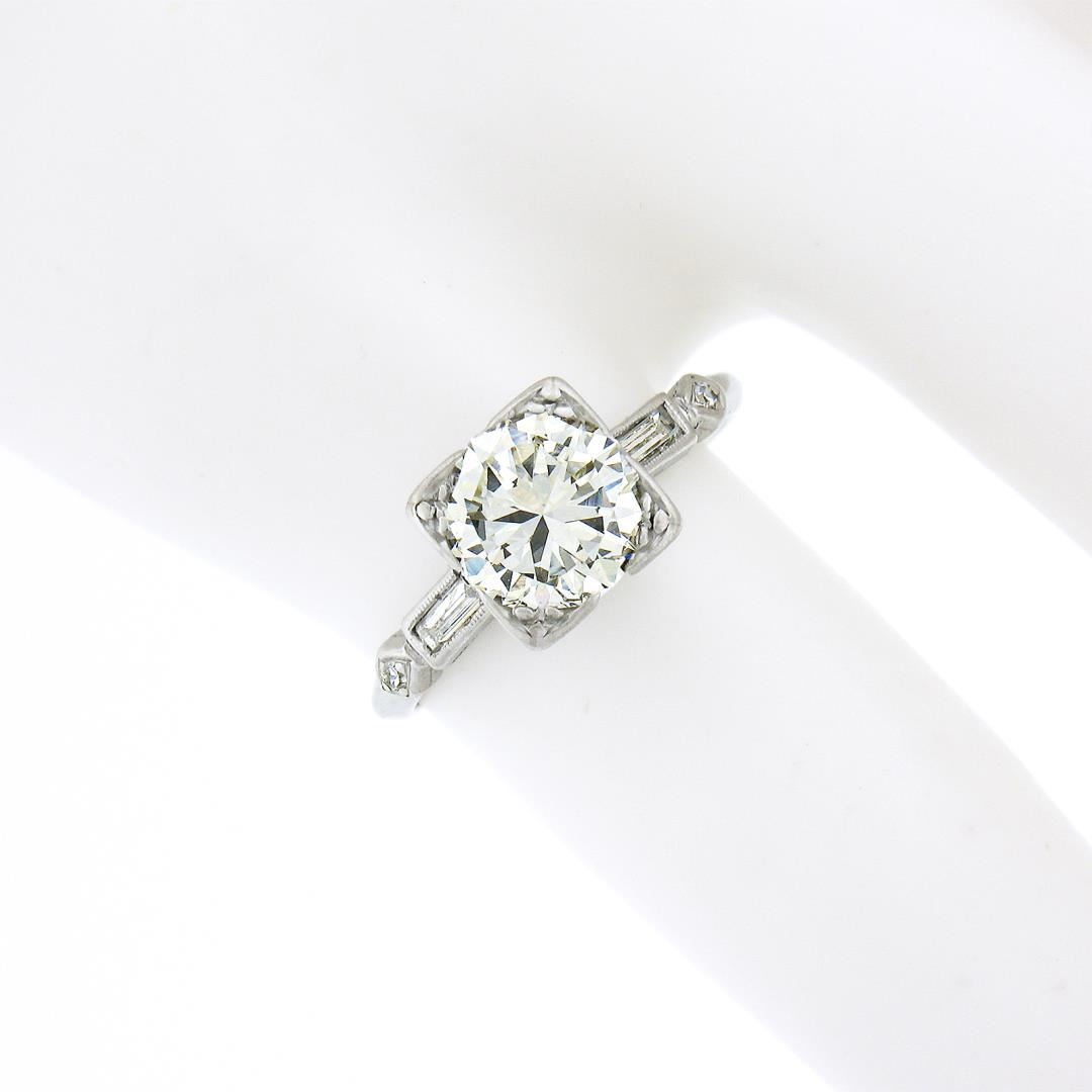 A vintage platinum engagement ring, w/ 1 old transitional cut natural diamond (I - VVS2 ; 1.33ct), 2 straight baguette cut natural diamonds (H/I - VS1/VS2 ; 0.14ctw), and 2 old single cut natural diamonds (G/H - VS1/VS2 ; 0.03ctw ). The ring is size 5.0, weighs a total of 2.90 grams, and measures 7.4mm wide.