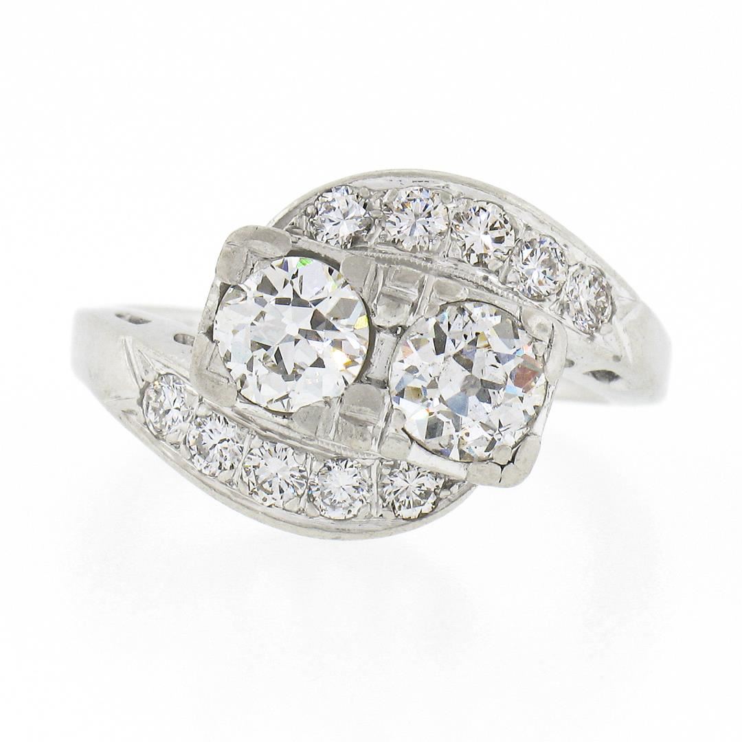 A vintage platinum bypass ring, with 2 old European cut natural diamonds (I/J - SI1/SI2 ; 1.16ctw), accented with 10 old transitional cut natural diamonds (G/H - VS1/VS2 ; 0.50ctw). The ring is size 6.5, weighs a total of 7.20 grams, and measures 12.6mm wide.