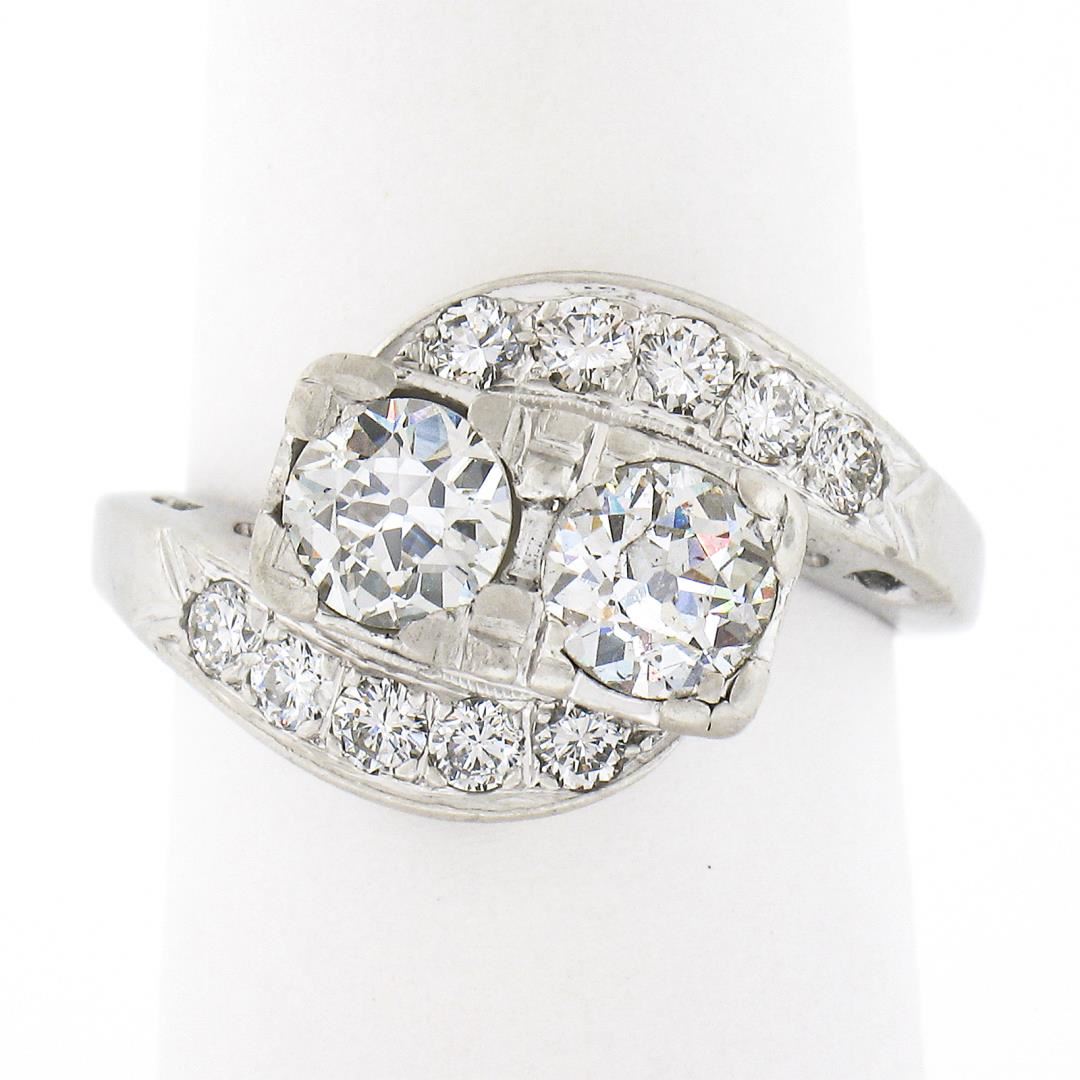 A vintage platinum bypass ring, with 2 old European cut natural diamonds (I/J - SI1/SI2 ; 1.16ctw), accented with 10 old transitional cut natural diamonds (G/H - VS1/VS2 ; 0.50ctw). The ring is size 6.5, weighs a total of 7.20 grams, and measures 12.6mm wide.