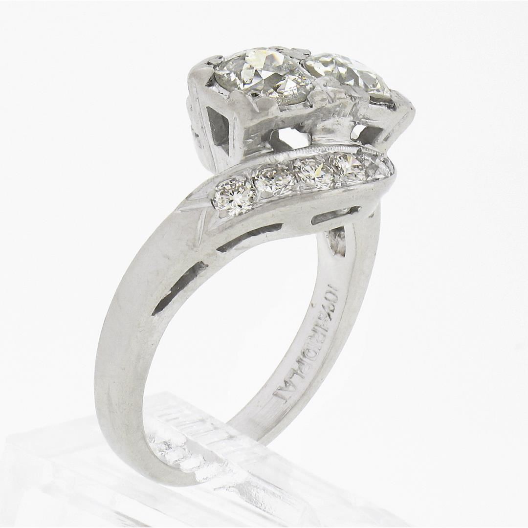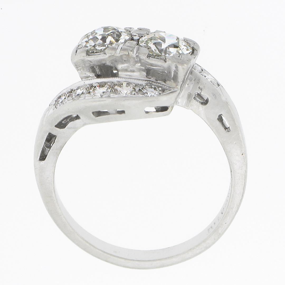 A vintage platinum bypass ring, with 2 old European cut natural diamonds (I/J - SI1/SI2 ; 1.16ctw), accented with 10 old transitional cut natural diamonds (G/H - VS1/VS2 ; 0.50ctw). The ring is size 6.5, weighs a total of 7.20 grams, and measures 12.6mm wide.