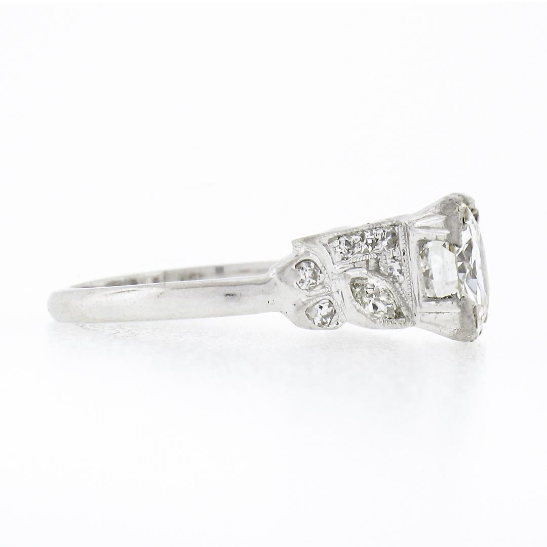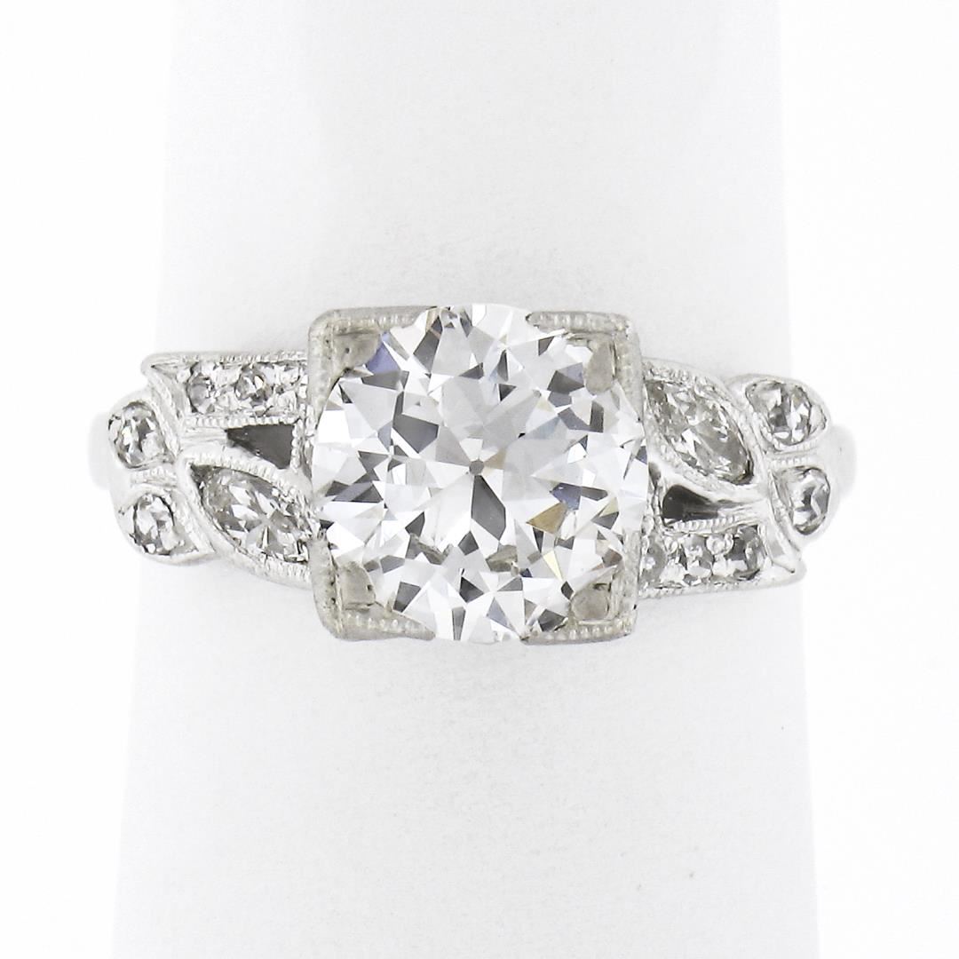 A vintage solid platinum ring, featuring with 1 GIA graded old European cut natural diamond (J - VS2; 1.33ct), 2 old marquise cut natural diamonds (H/I -VS2/SI1 ; 0.16ctw), and 12 old single cut natural diamonds (G/H - VS1/VS2 ; 0.18ctw). The ring is size 4.5, weighs a total of 4.0 grams, and measures 7.60mm wide. Comes with all original relevant certifications.