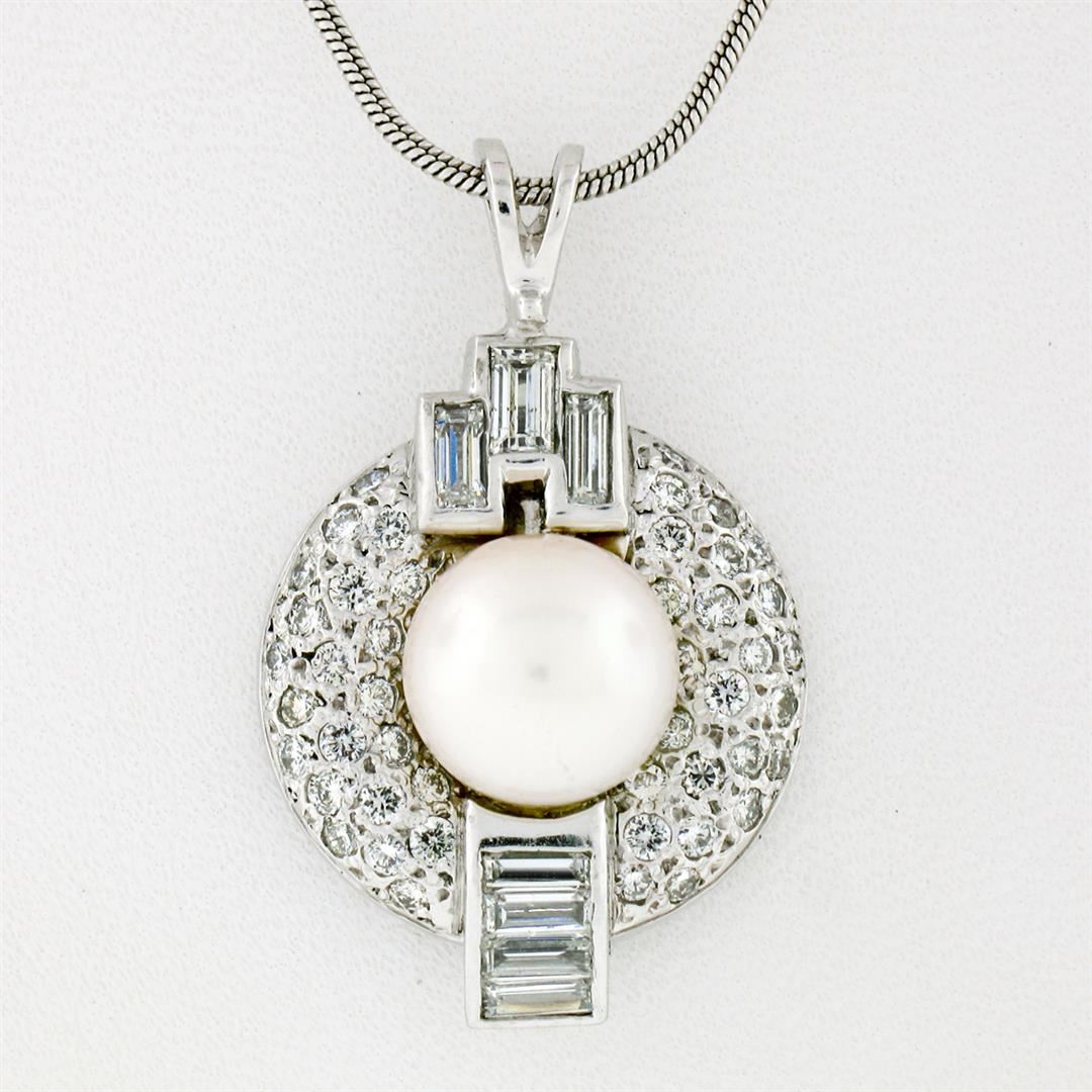 A vintage solid platinum pendant necklace. featuring 1 round shape natural pearl (9.0mm), surrounded with 51 baguette and old transitiona cut natural diamonds ( F/G - VS1/VS2 ; 1.70ctw). The pendant weighs a total of 13.28 grams, measures 29.45x18.25mm including the bail, and 16 inch snake link chain.