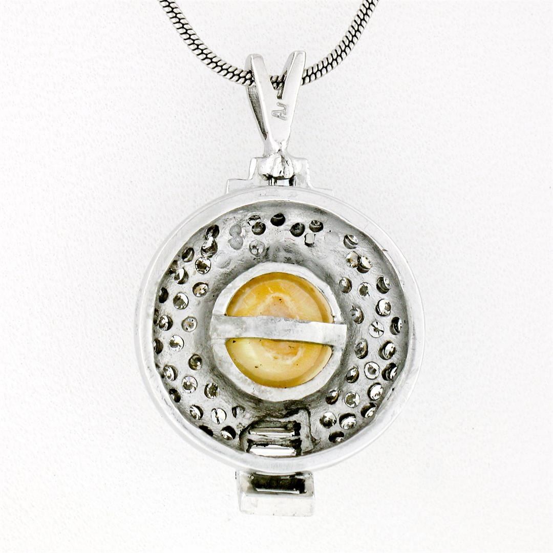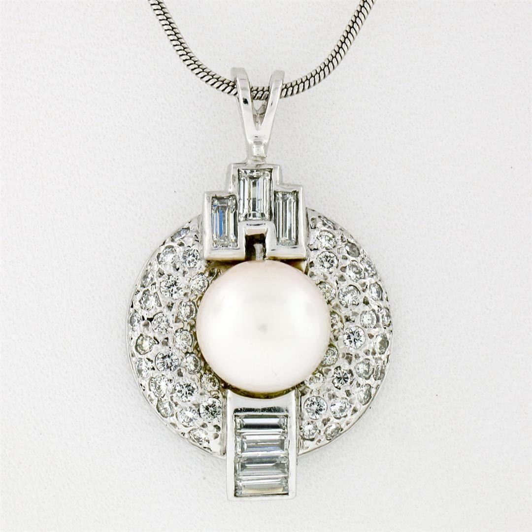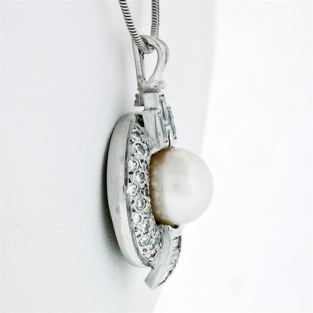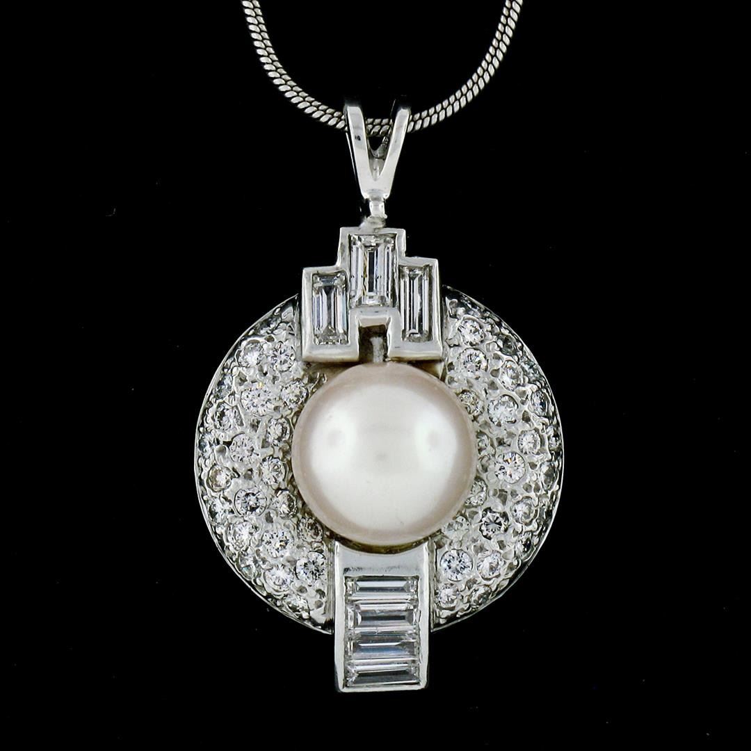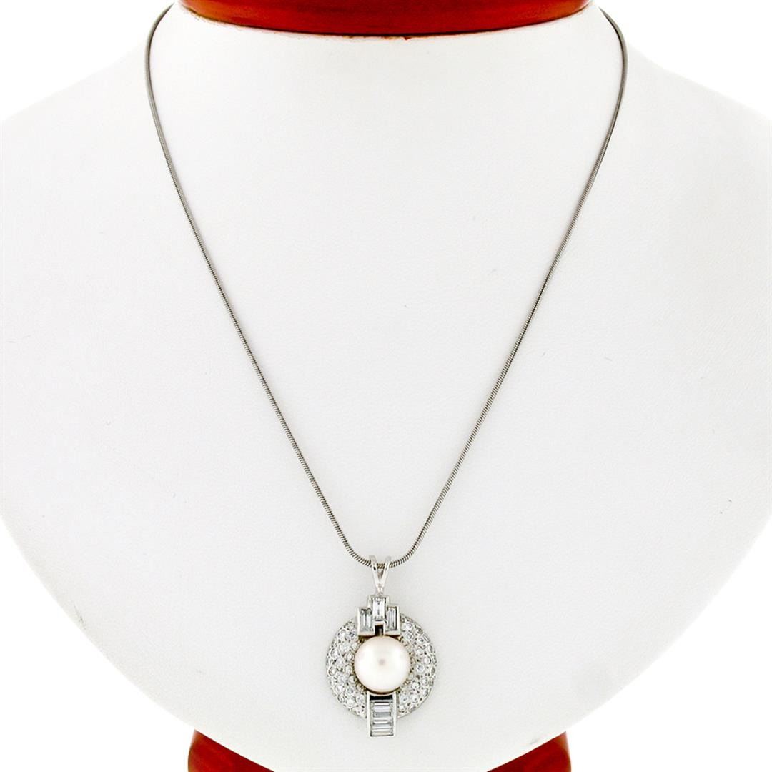 A vintage solid platinum pendant necklace. featuring 1 round shape natural pearl (9.0mm), surrounded with 51 baguette and old transitiona cut natural diamonds ( F/G - VS1/VS2 ; 1.70ctw). The pendant weighs a total of 13.28 grams, measures 29.45x18.25mm including the bail, and 16 inch snake link chain.