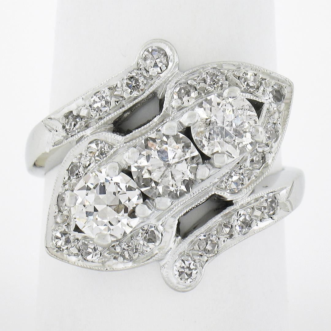 A vintage solid platinum bypass ring, with 3 old european cut natural diamonds (H-J - VS2-I1 ; 1.68ctw), and 22 old single cut natural diamonds (G/H - VS2-I1 ; 0.27ctw). The ring is size 9.0, weighs a total of 11.38 grams, and measures 18.7mm wide.