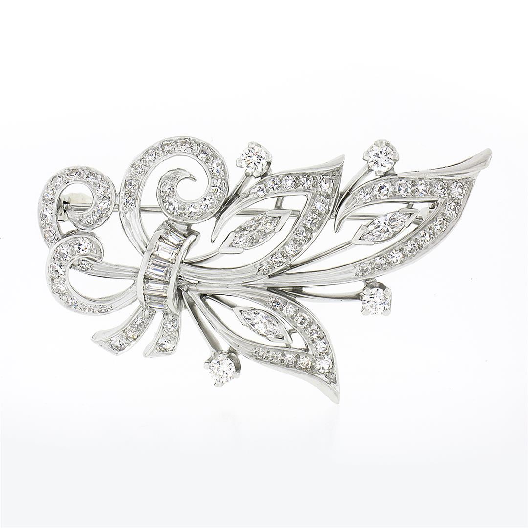A vintage solid platinum pin brooch, with 73 old cut natural diamonds (F/G - VS1/VS2 ; 1.18ctw), and 5 baguette cut natural diamonds (G/H - VS1/VS2 ; 0.25ctw), and 3 marquise cut natural diamonds (G/H - VS1/VS2 ; 0.55ctw). Measures 26.20x44.80mm and weighs a total of 14.06 grams.