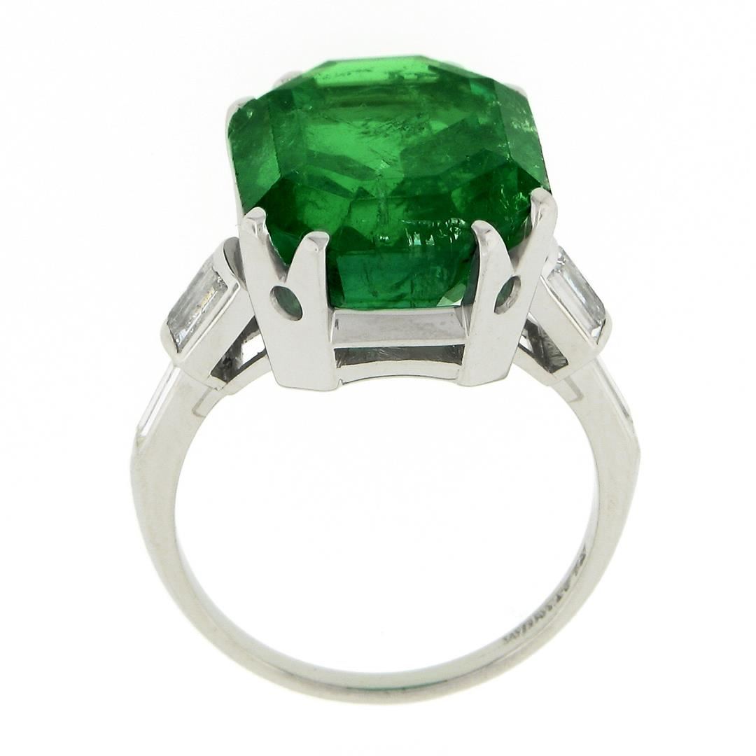 A vintage solid platinum ring, with 1 AGL graded emerald cut natural emerald (11.56ct), and 6 baguette cut natural diamonds (G/H - VS1-SI2 ; 0.60ctw). The ring is size 7.0, weighs a total of 9.40 grams, and measures 16.2mm wide. Comes with all original relevant certifications.