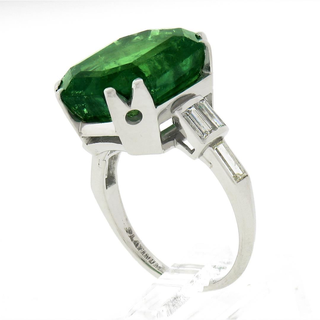 A vintage solid platinum ring, with 1 AGL graded emerald cut natural emerald (11.56ct), and 6 baguette cut natural diamonds (G/H - VS1-SI2 ; 0.60ctw). The ring is size 7.0, weighs a total of 9.40 grams, and measures 16.2mm wide. Comes with all original relevant certifications.