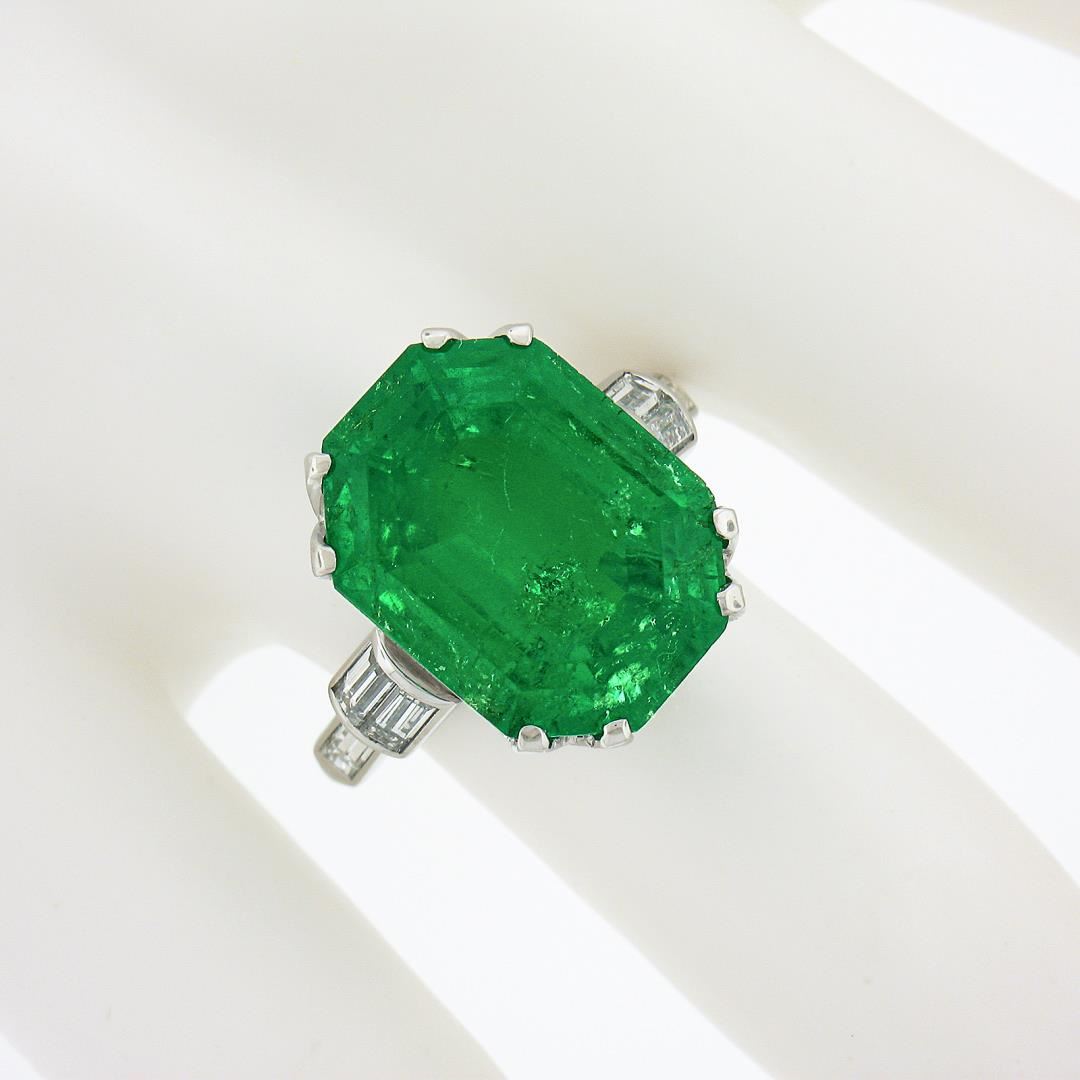 A vintage solid platinum ring, with 1 AGL graded emerald cut natural emerald (11.56ct), and 6 baguette cut natural diamonds (G/H - VS1-SI2 ; 0.60ctw). The ring is size 7.0, weighs a total of 9.40 grams, and measures 16.2mm wide. Comes with all original relevant certifications.